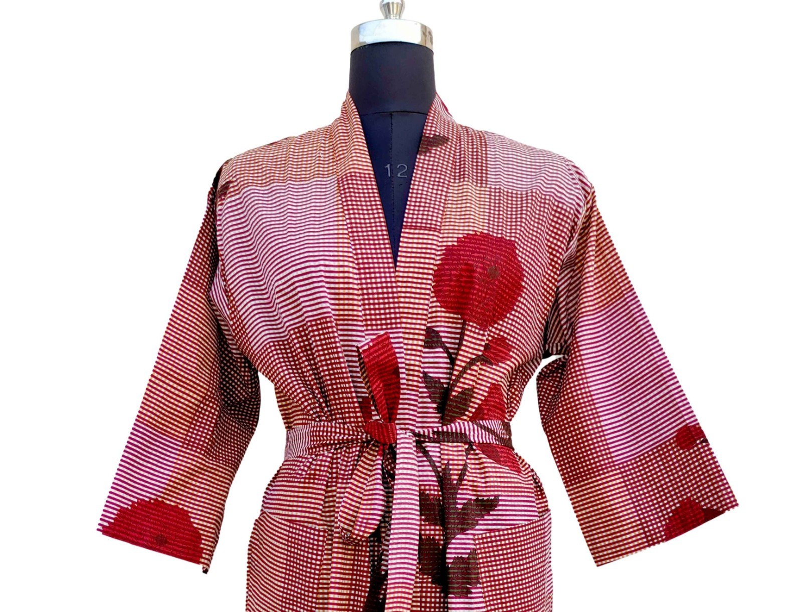 Women s Cotton Kimono Robe Red Boho Floral Print Bathrobe, Loungewear with Belt