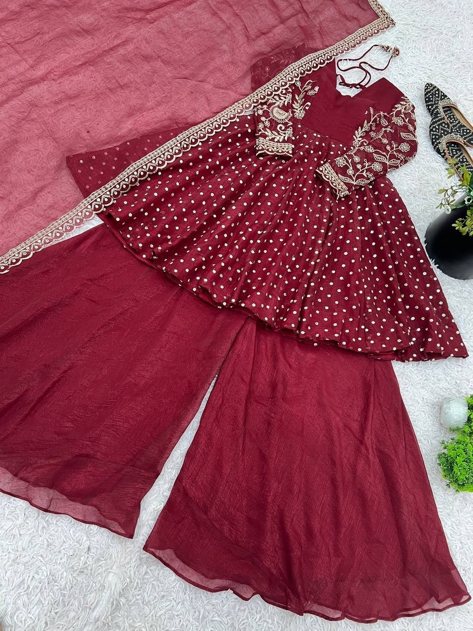 как выглядит Stunning Look Crunchy Silk Maroon Top Palazzo And Dupatta For Women Wear фото