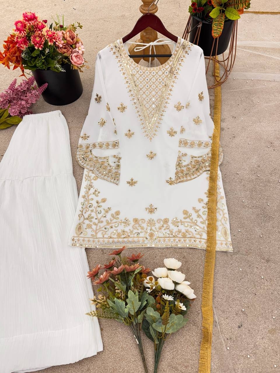 Attractive Look White Faux Georgette Top Palazzo With Dupatta For Reception Wear