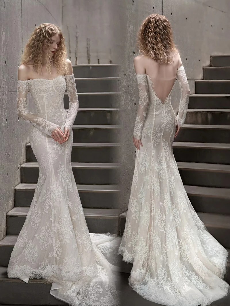 Wedding Dress Mermaid lace Neck With Deep V Back Long Sleeves Off The Shoulder