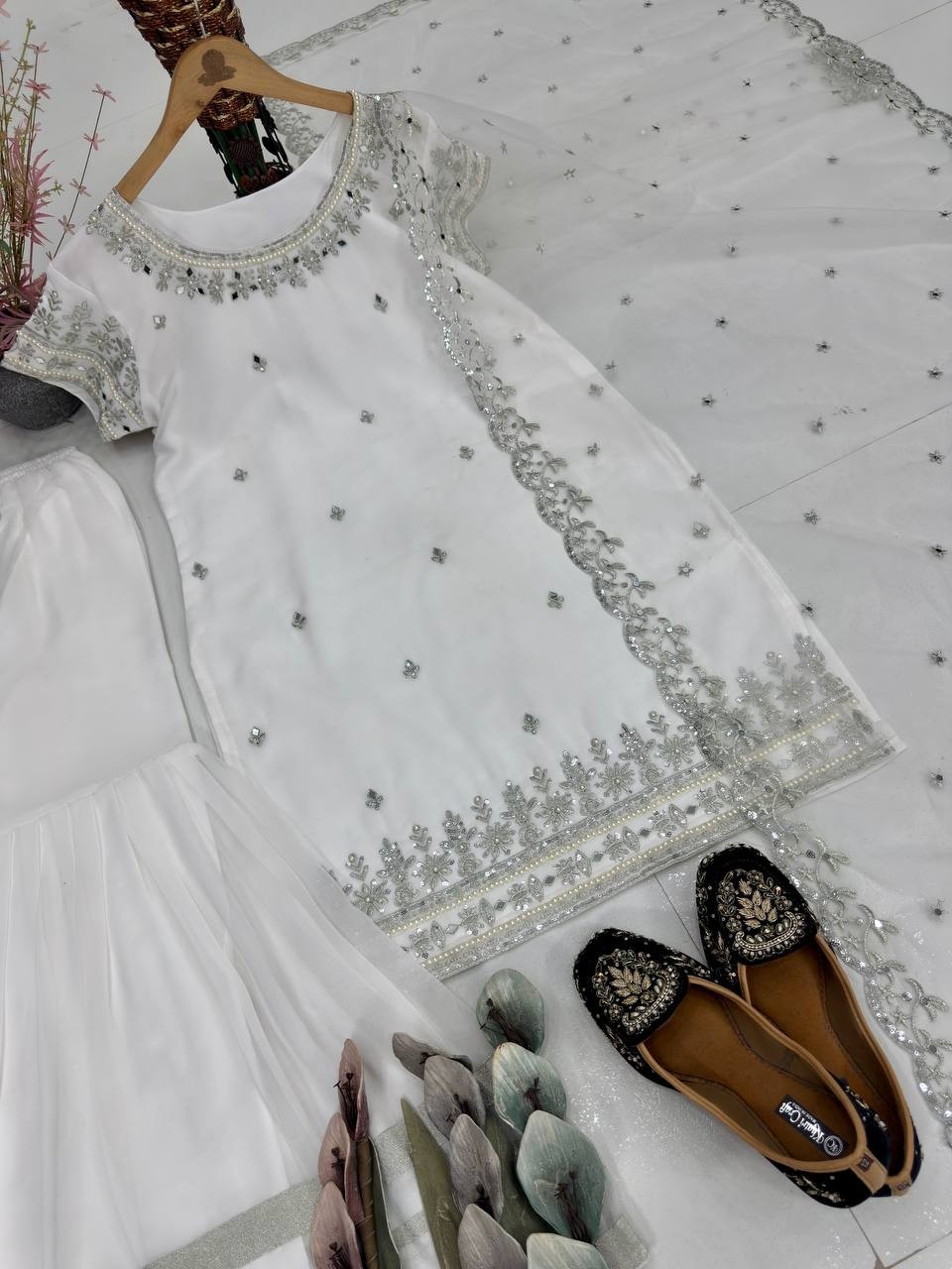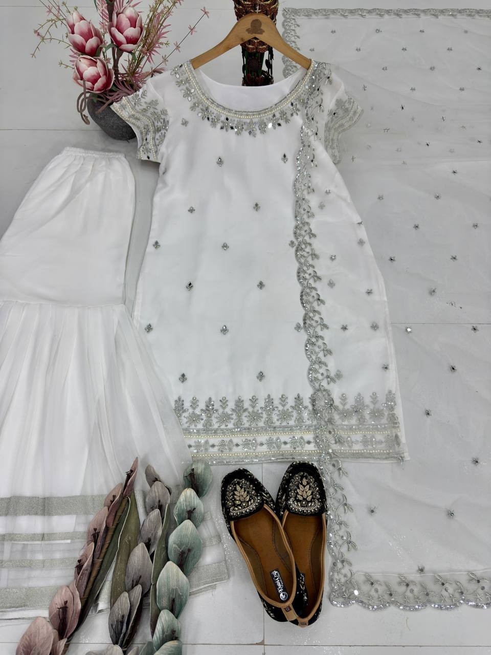 как выглядит Exclusive Designer White Faux Georgette Kurta Palazzo With Dupatta For Women фото