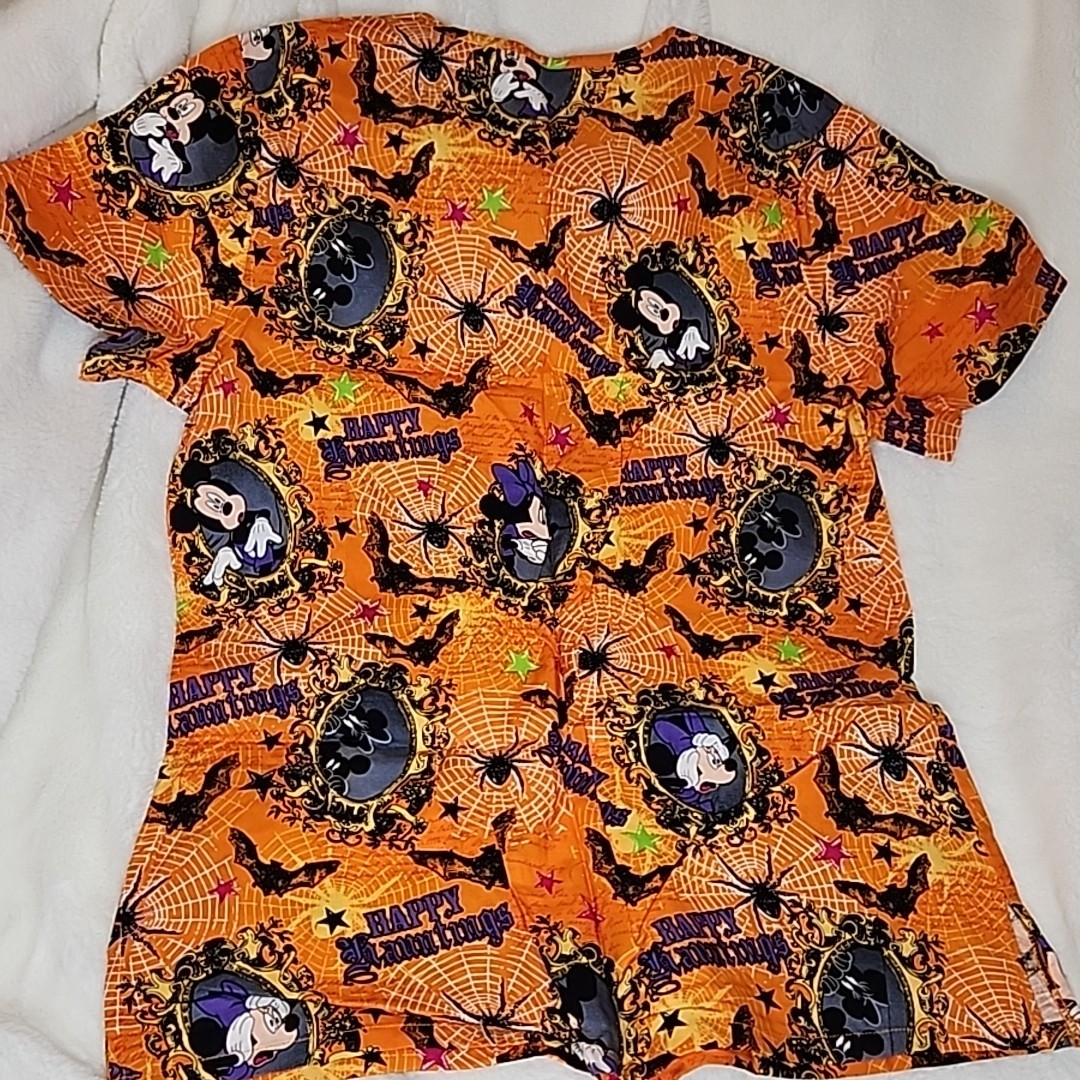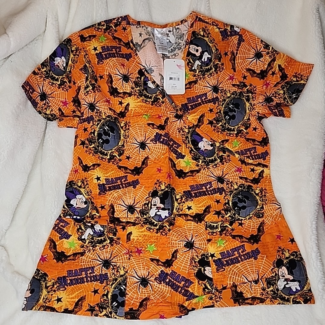 Disney Mickey Mouse Haunted Halloween Medical Scrub Top Orange Women's Sz Small