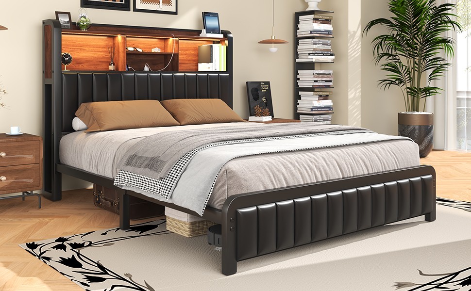 Full Queen Size Metal Bed Frame with Storage Charging Headboard, LED Light