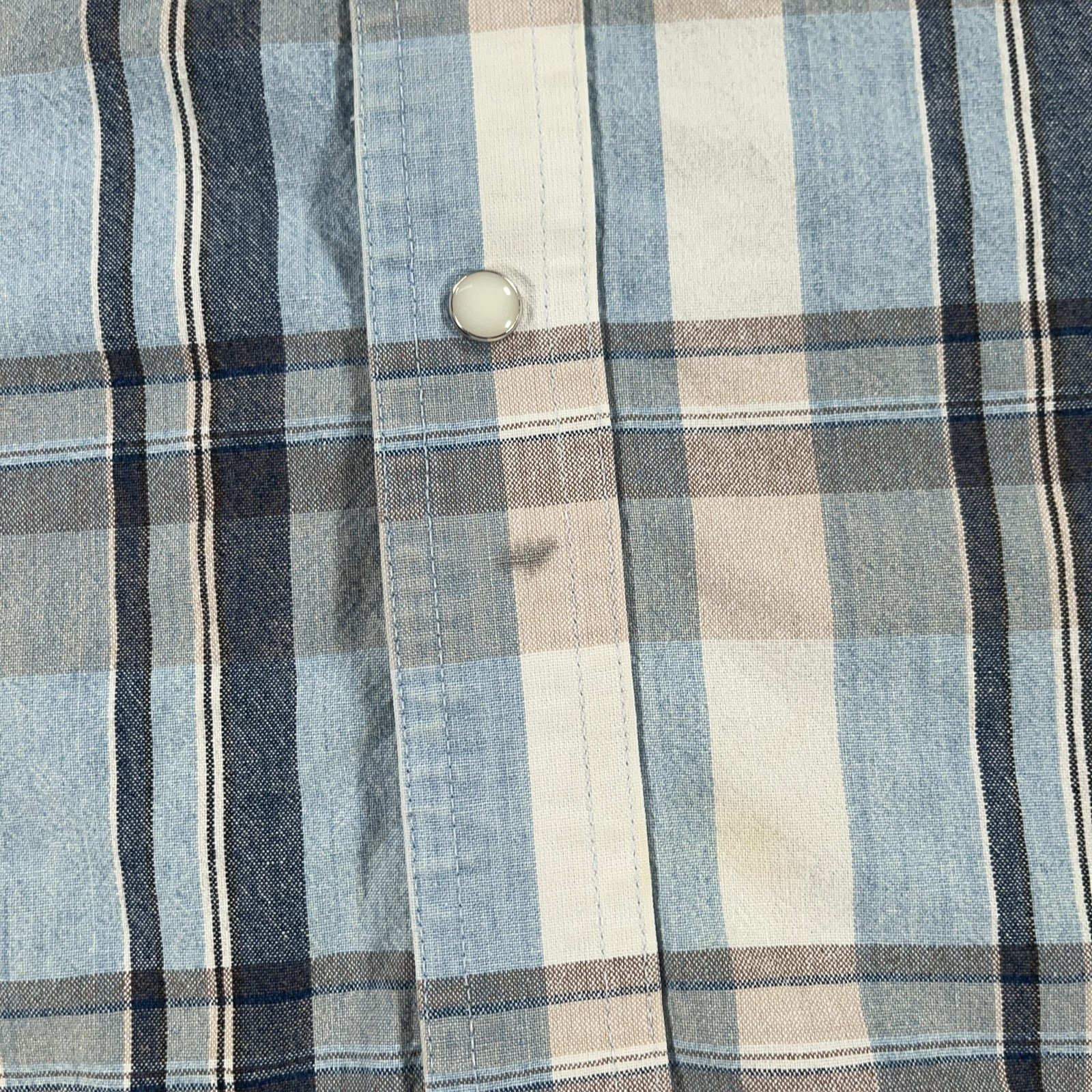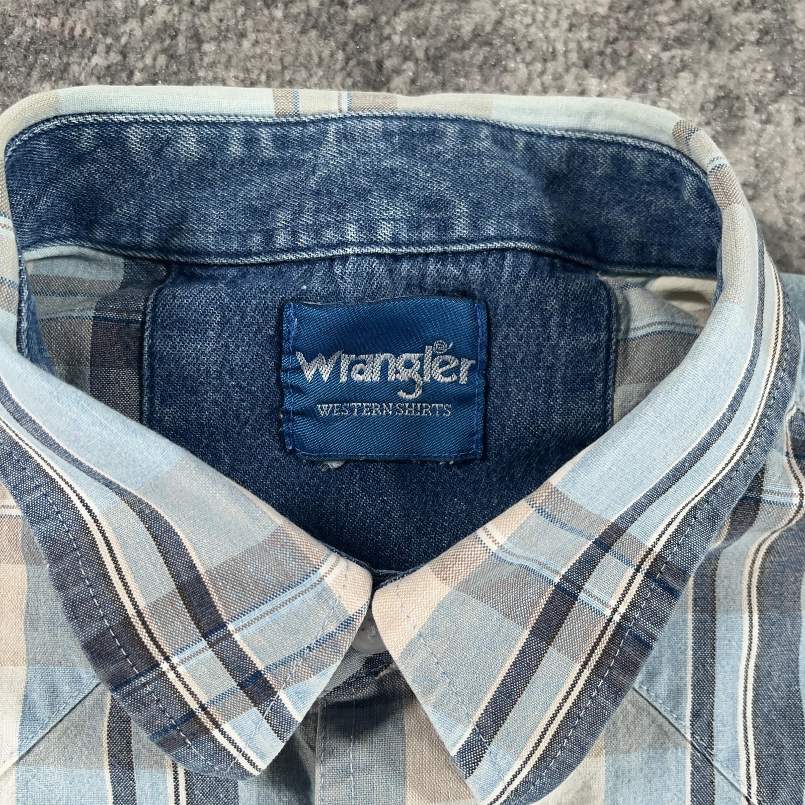 Vintage Wrangler Shirt Mens XXL Blue Beige Plaid Western Short Sleeve Pearl Snap