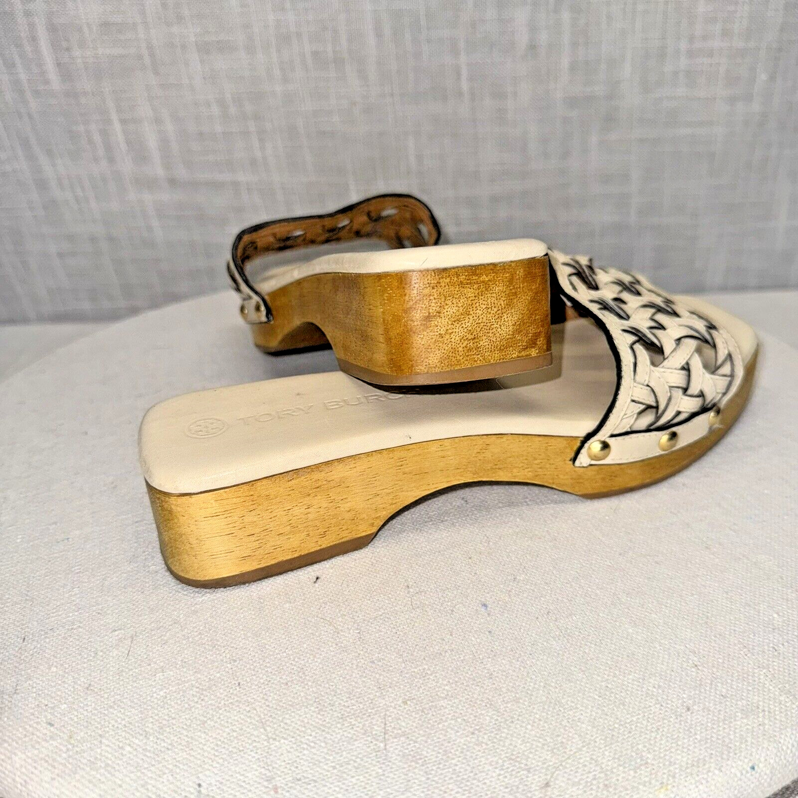 TORY BURCH Leather Cream Basketweave Wooden Clogs Classic Luxe US 6