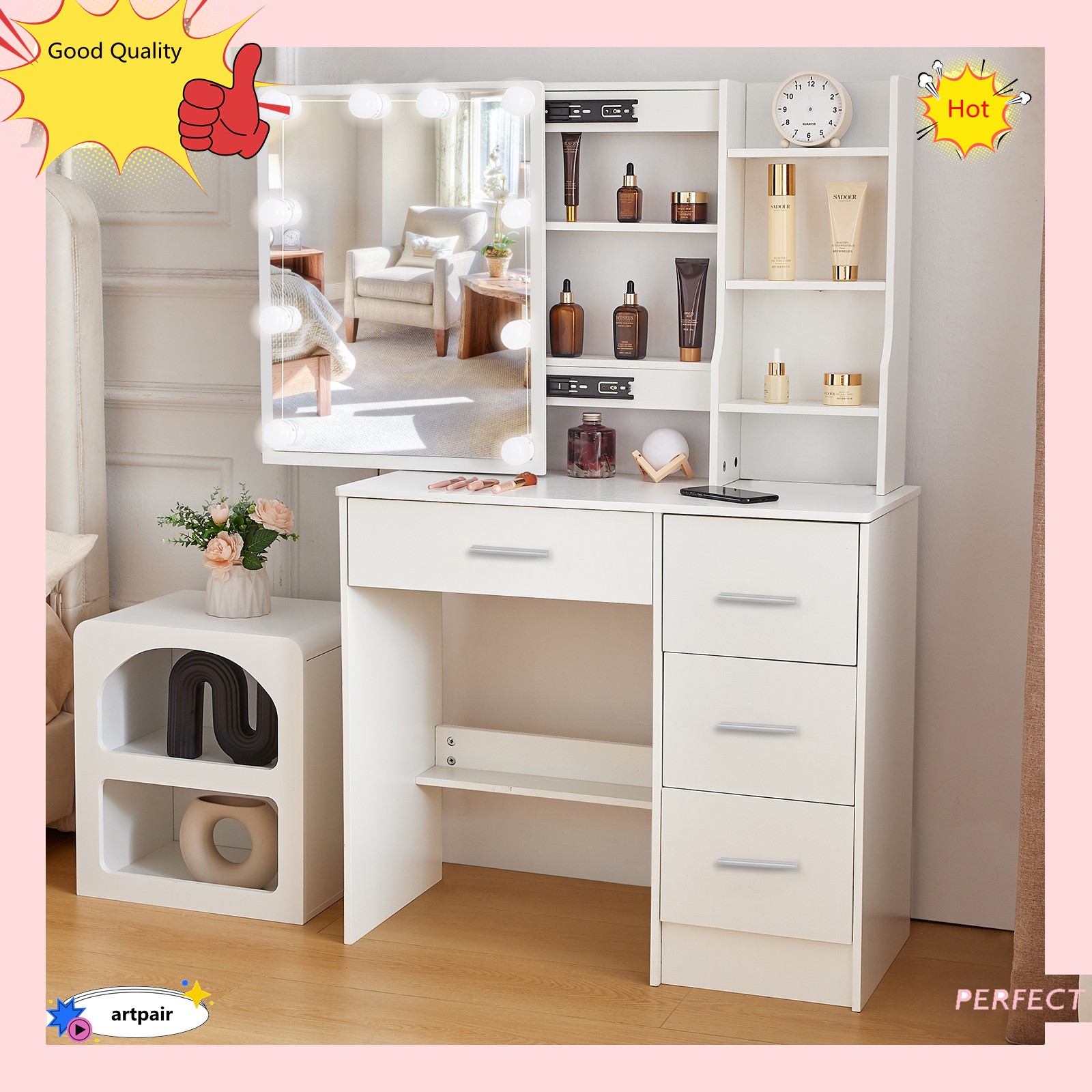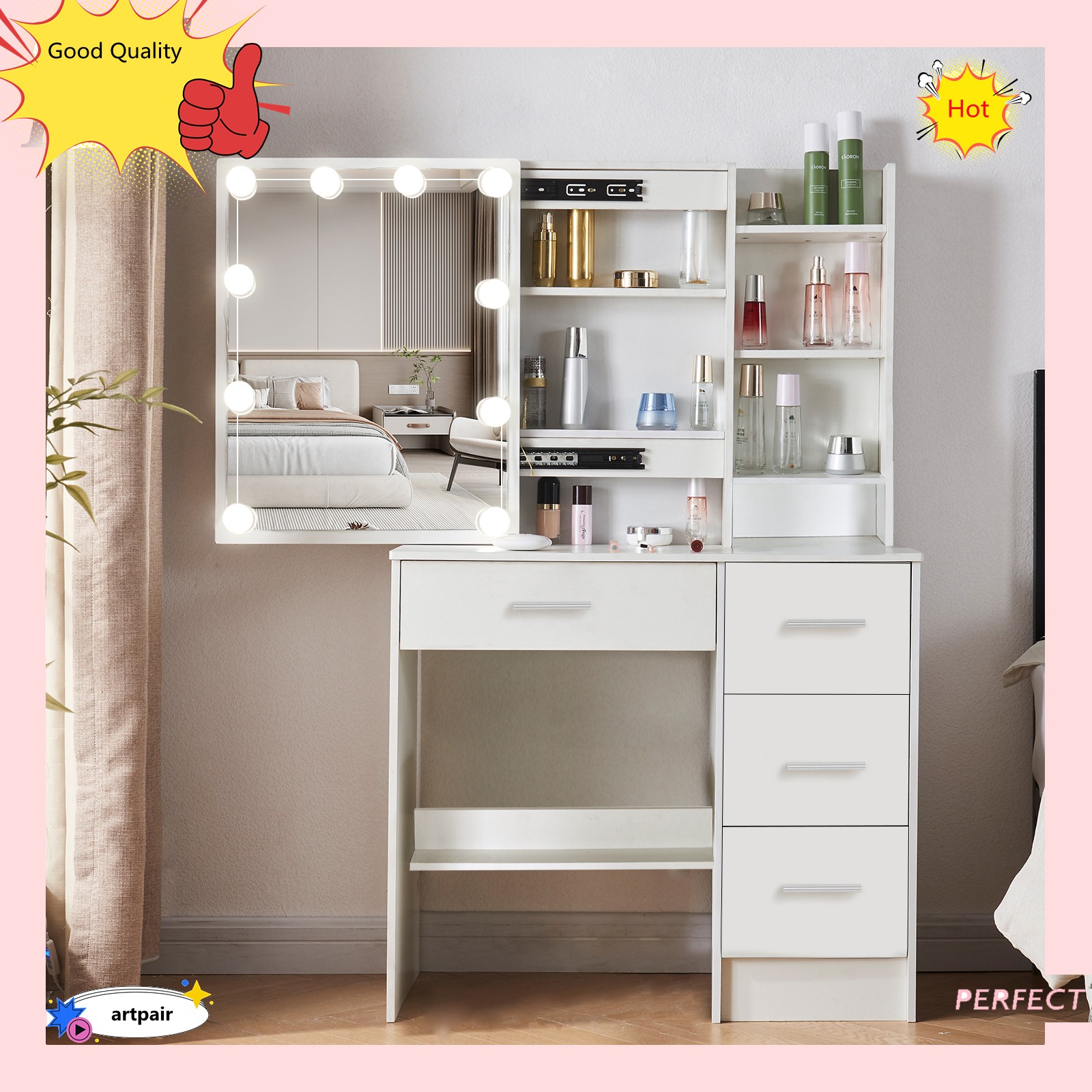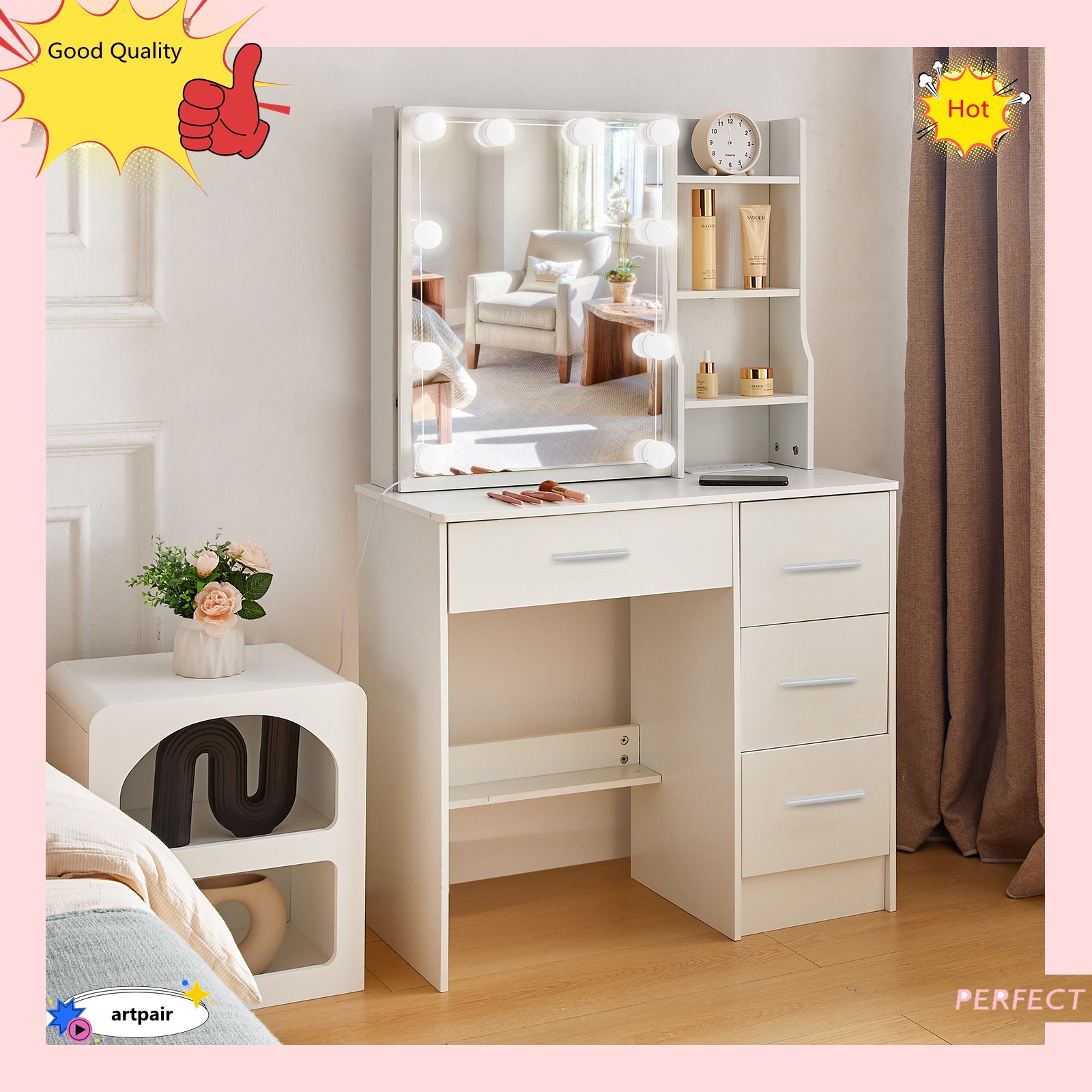как выглядит Vanity Desk with Mirror and Led Lights, Makeup Table Set with 4 Drawers Shelves фото