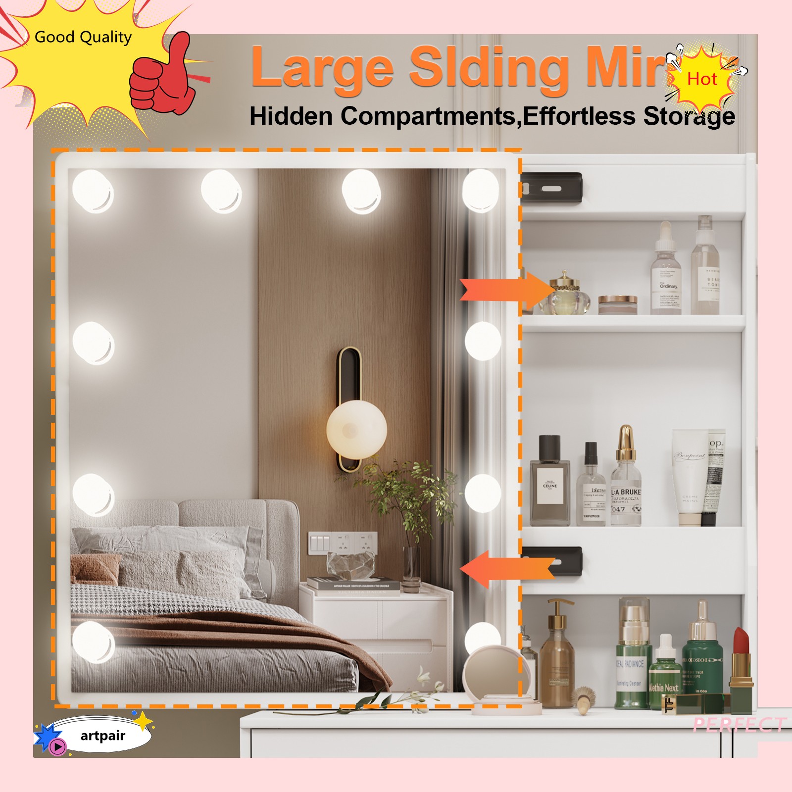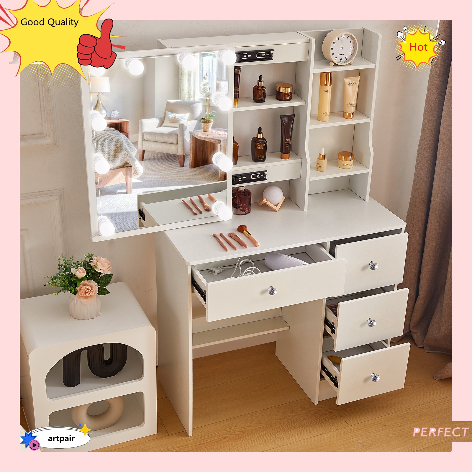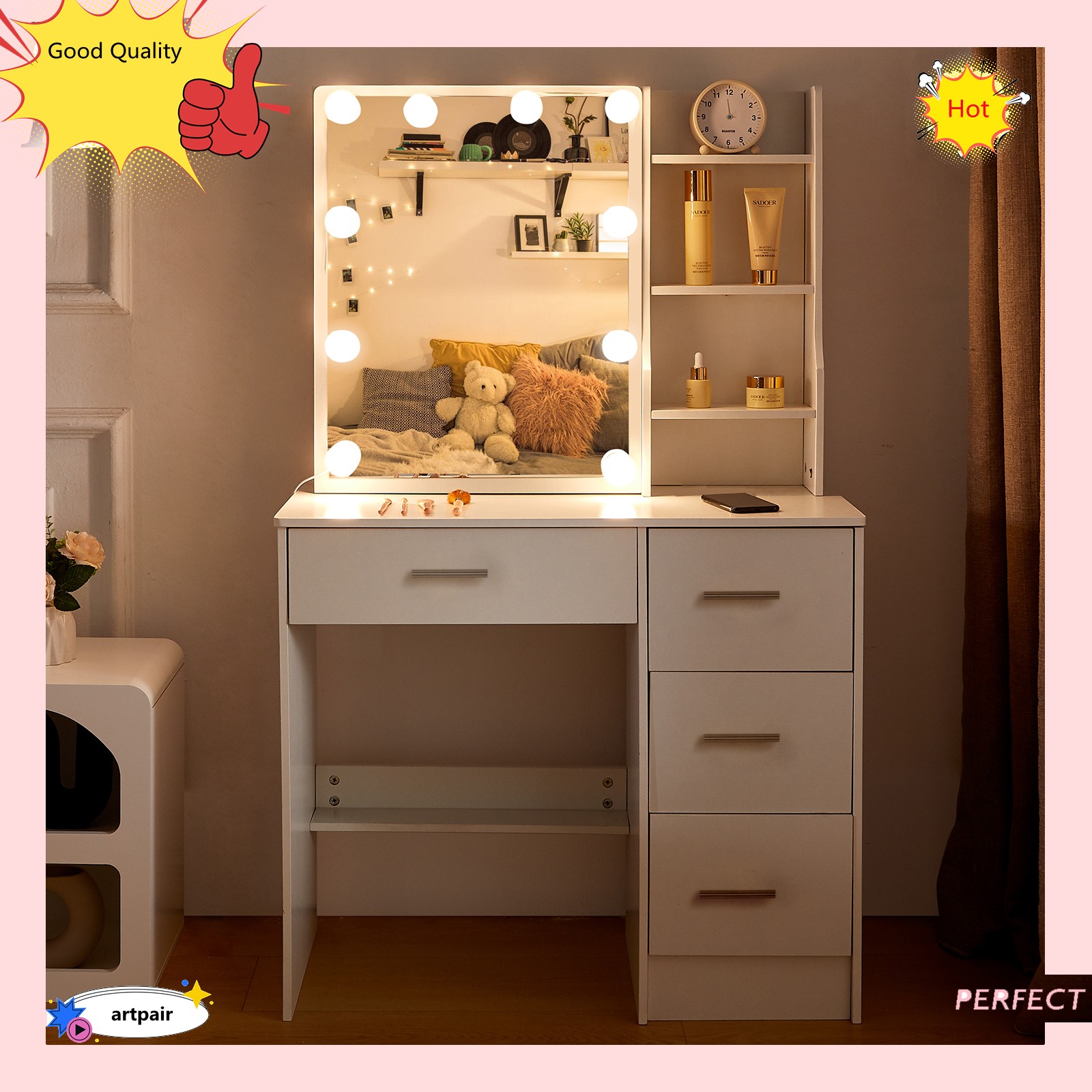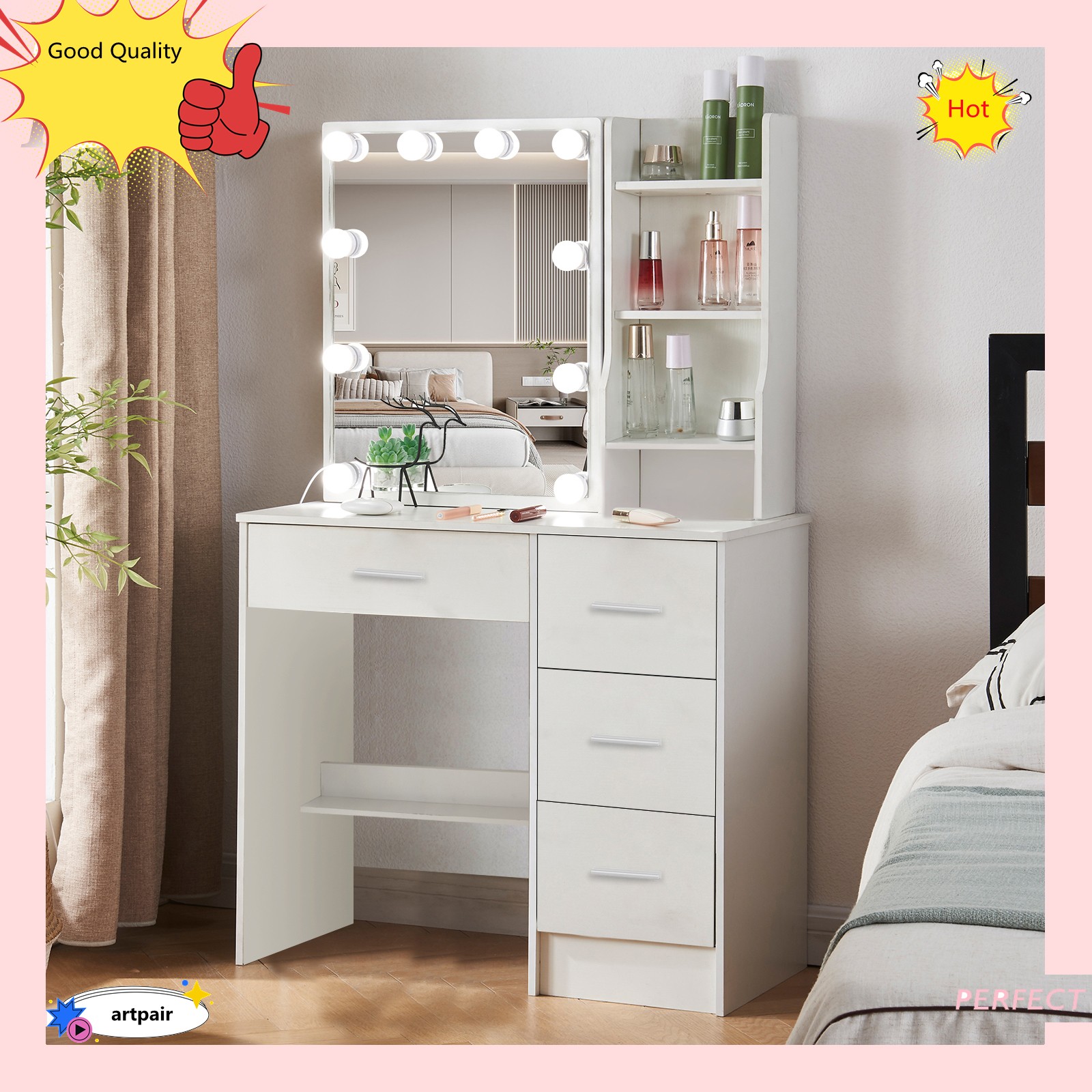 Vanity Desk with Mirror and Led Lights, Makeup Table Set with 4 Drawers Shelves