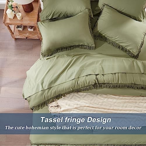 Comforter Set - Tassel Boho Bed in a Bag 7 Piece with Queen Olive Green