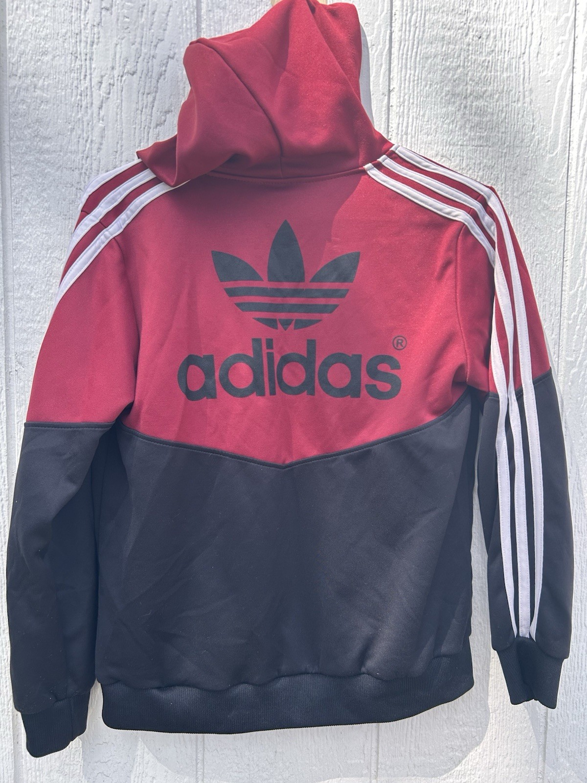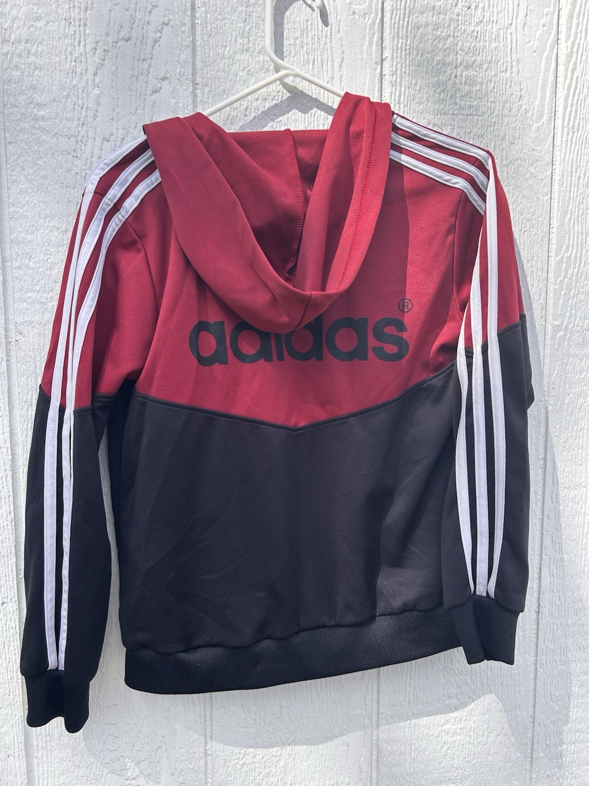 как выглядит Adidas Youth L 14/16 Black Long Sleeve Zip Up Jacket EUC Kids Hoody Maroon фото