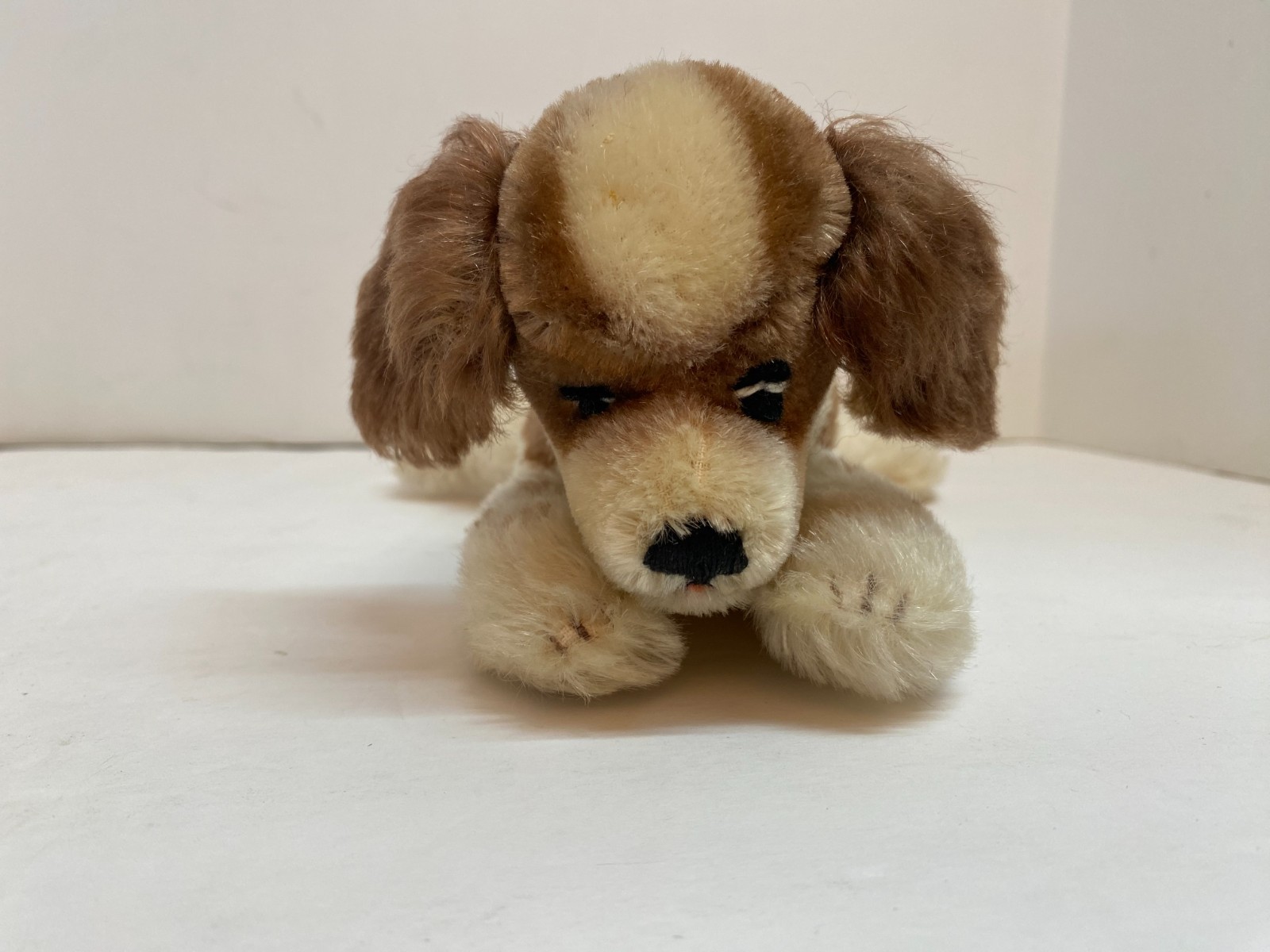 Steiff Puppy laying flat on belly, small 7 long, 4 tall