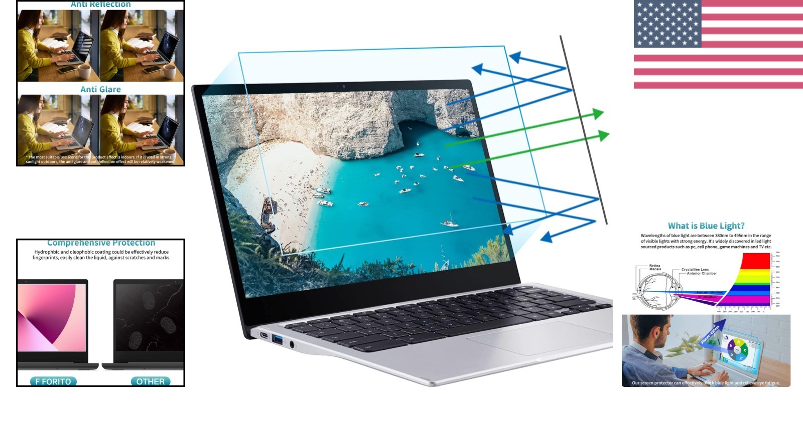 Особенности: Anti-Scratch, Anti-Glare, Anti-Reflective, Anti-Static, Hydrophobic Coating, Oleophobic Coating, Blue Light Filtering