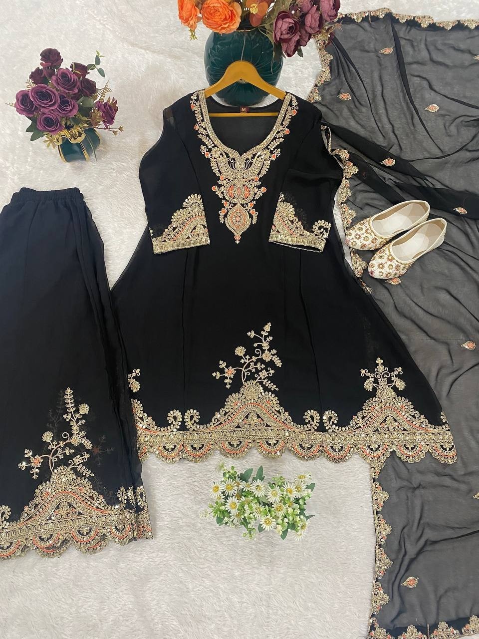 как выглядит New Stylish Heavy Faux Georgette Black Top Palazzo With Dupatta For Ethnic Wear фото