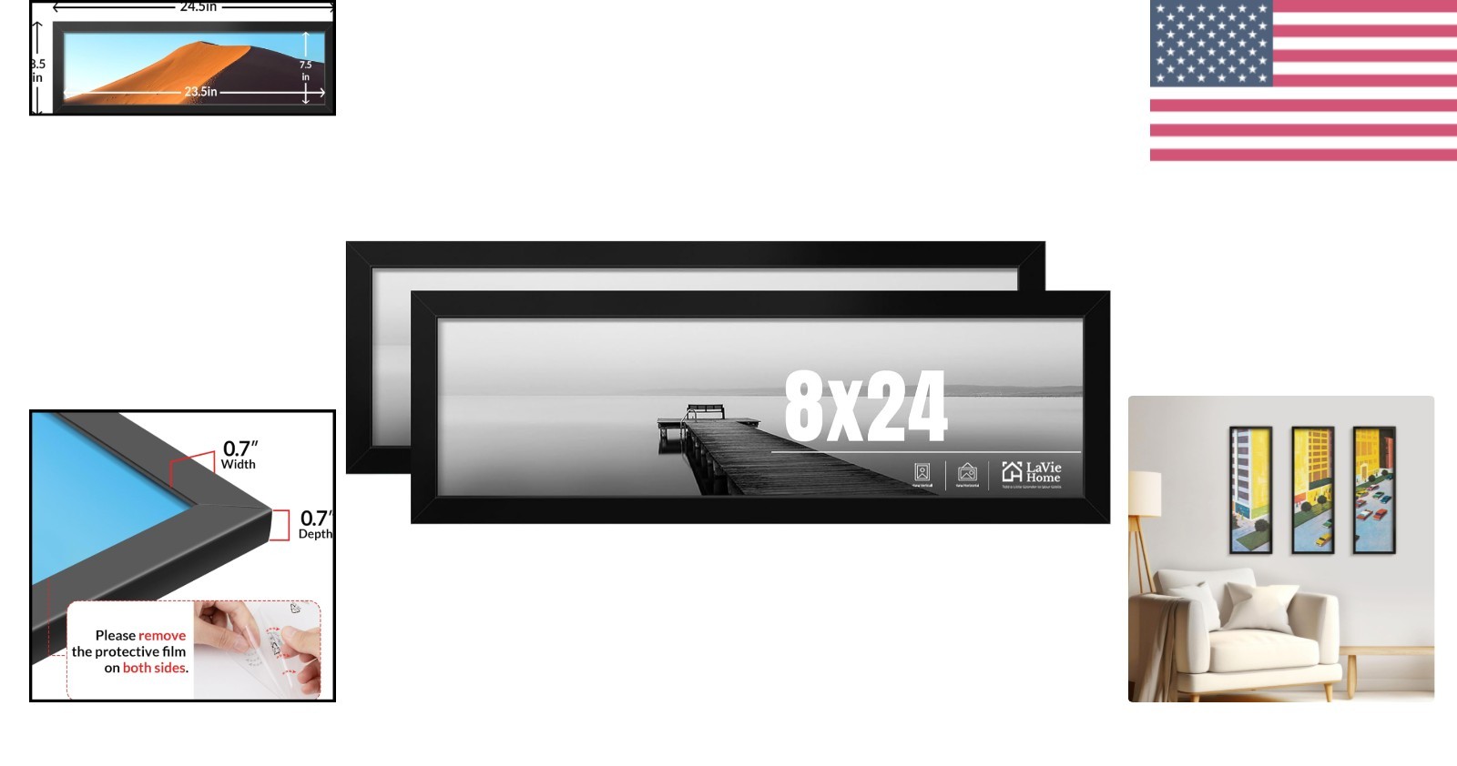Elegant 8x24 Black Picture Frames 2 Pack with HD Plexiglass - Classic Style