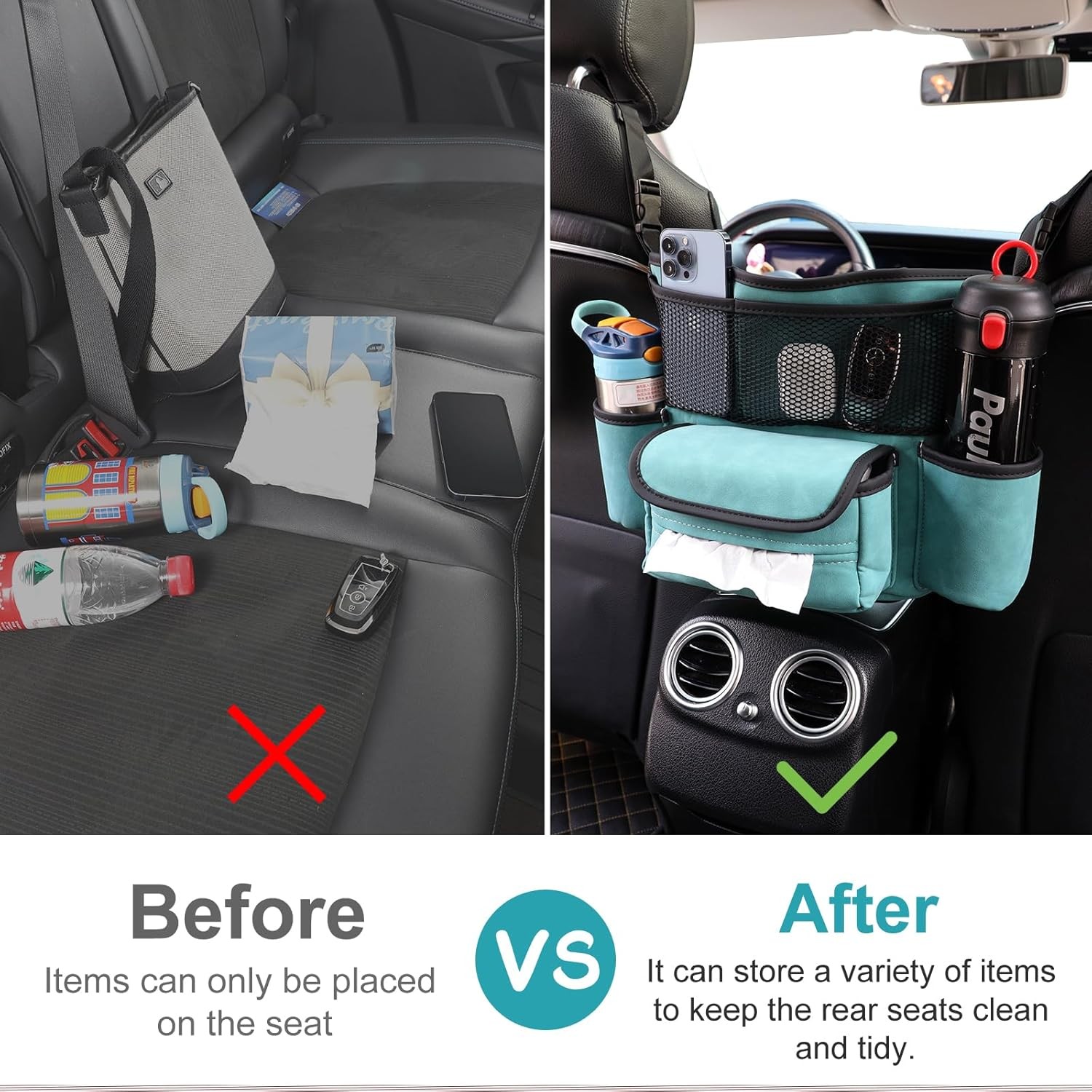 Car Purse Holder Between Front Seats, Auto Seat Organizer with Net Storage Blue