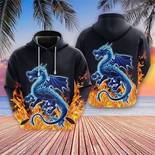3D Blue Fire Dragon Hoodie Unisex Fantasy Flame Pullover Sweatshirt