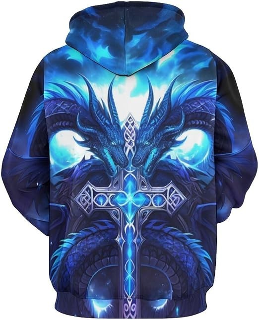 как выглядит 3D Hoodie Twin Blue Dragons with Sword Cross Fantasy Unisex Pullover фото