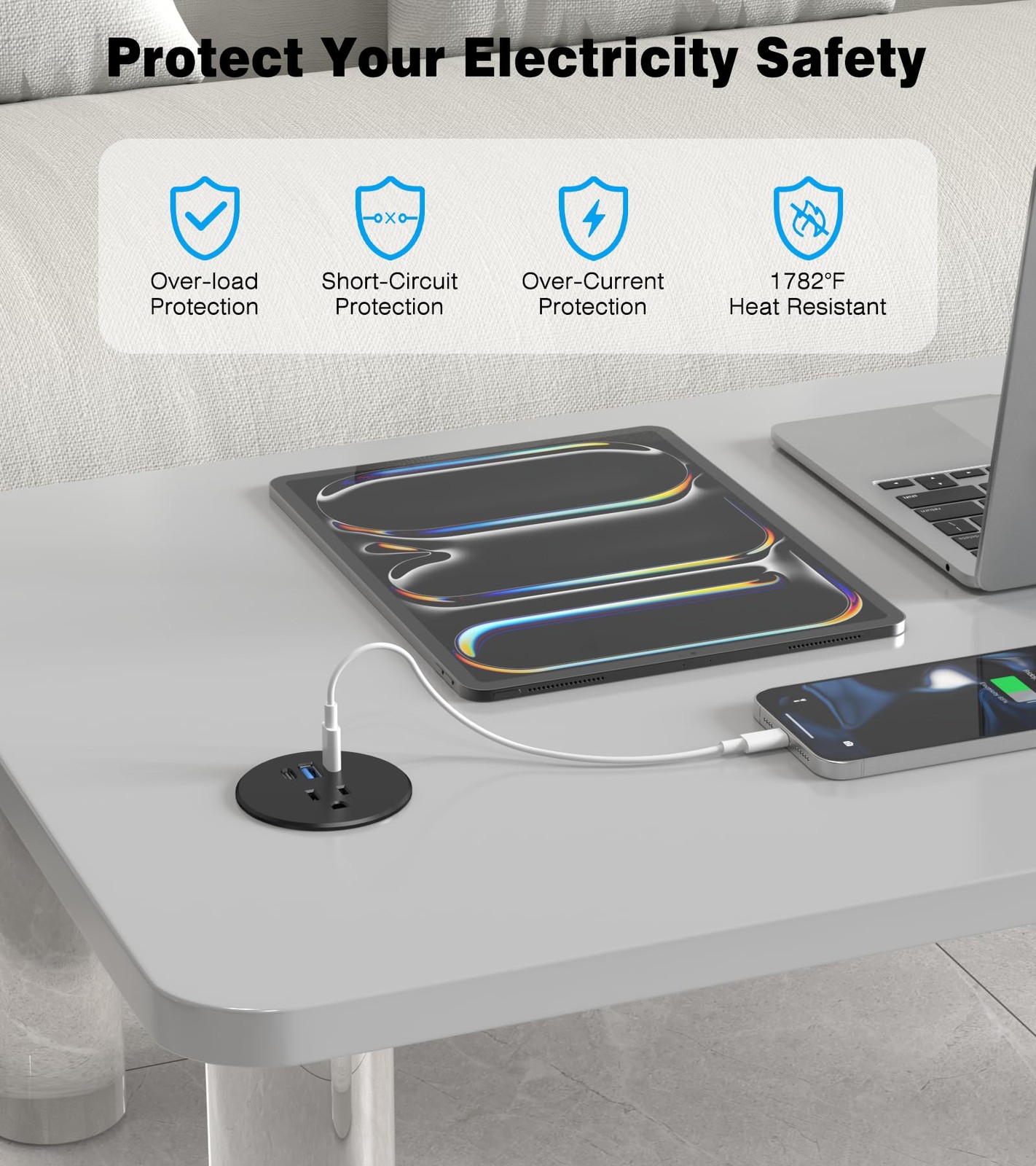 Desk Grommet Power Outlet, 2.5 inch Desktop Recessed Outlet with 20W Fast Cha...