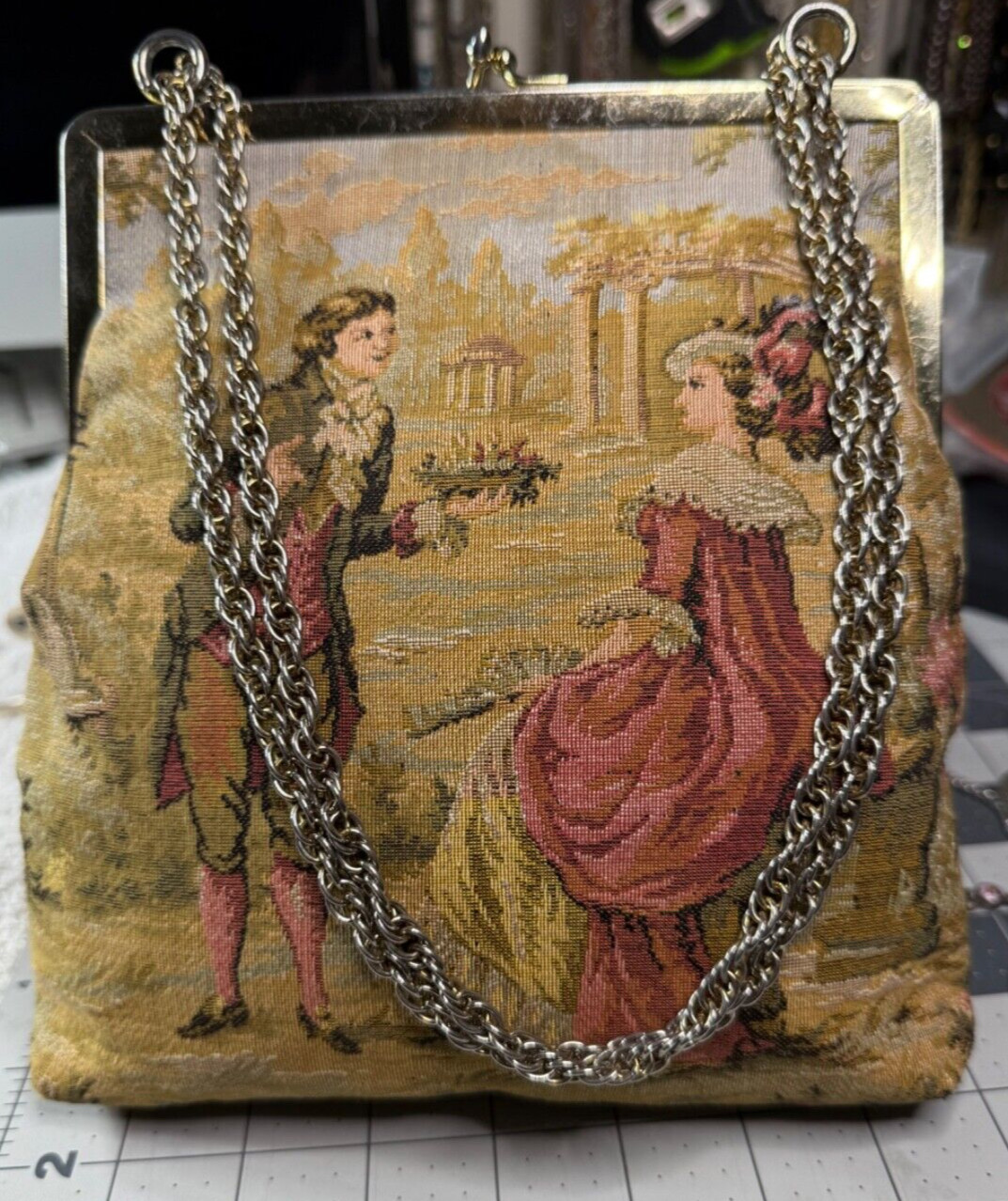JR Florida USA Purse Petite Point Tapestry- Courting Scene, Ornate Metal Frame