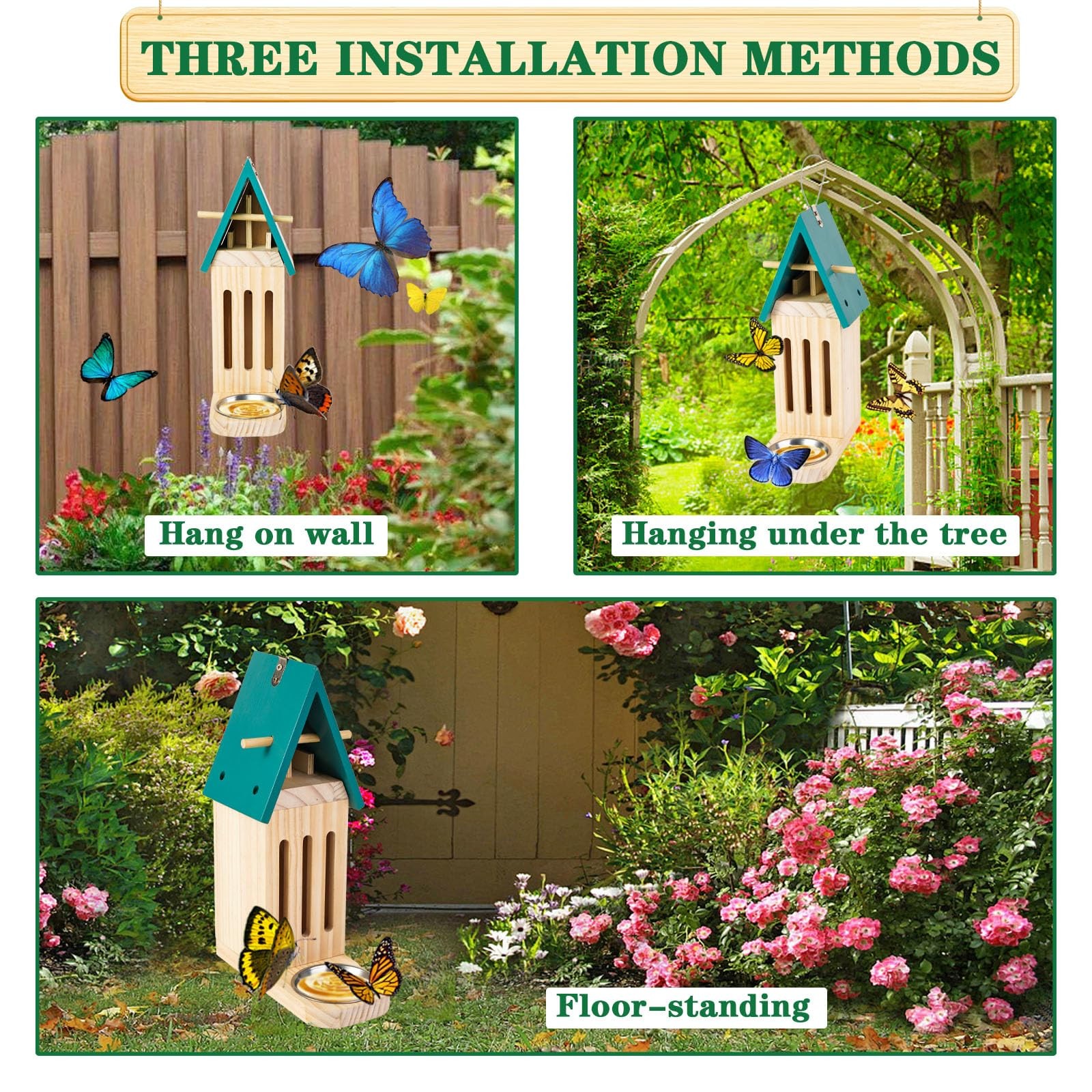 3-in-1 Butterfly House and Feeder for Outdoor, Natural Wooden Hanging Butterf...