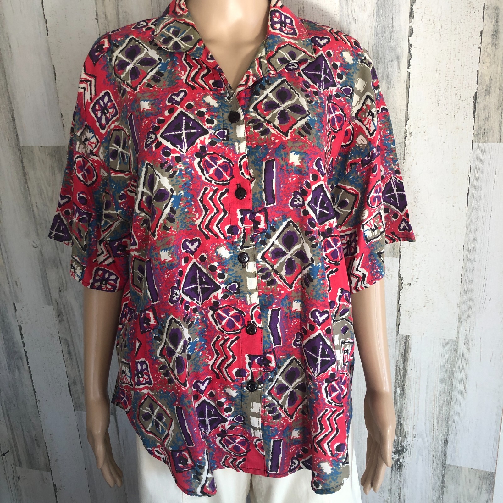 vtg 80s Relaxed Fit Button Shirt Sz 13 Rayon Hawaiian Boho Blouse Short Slv USA