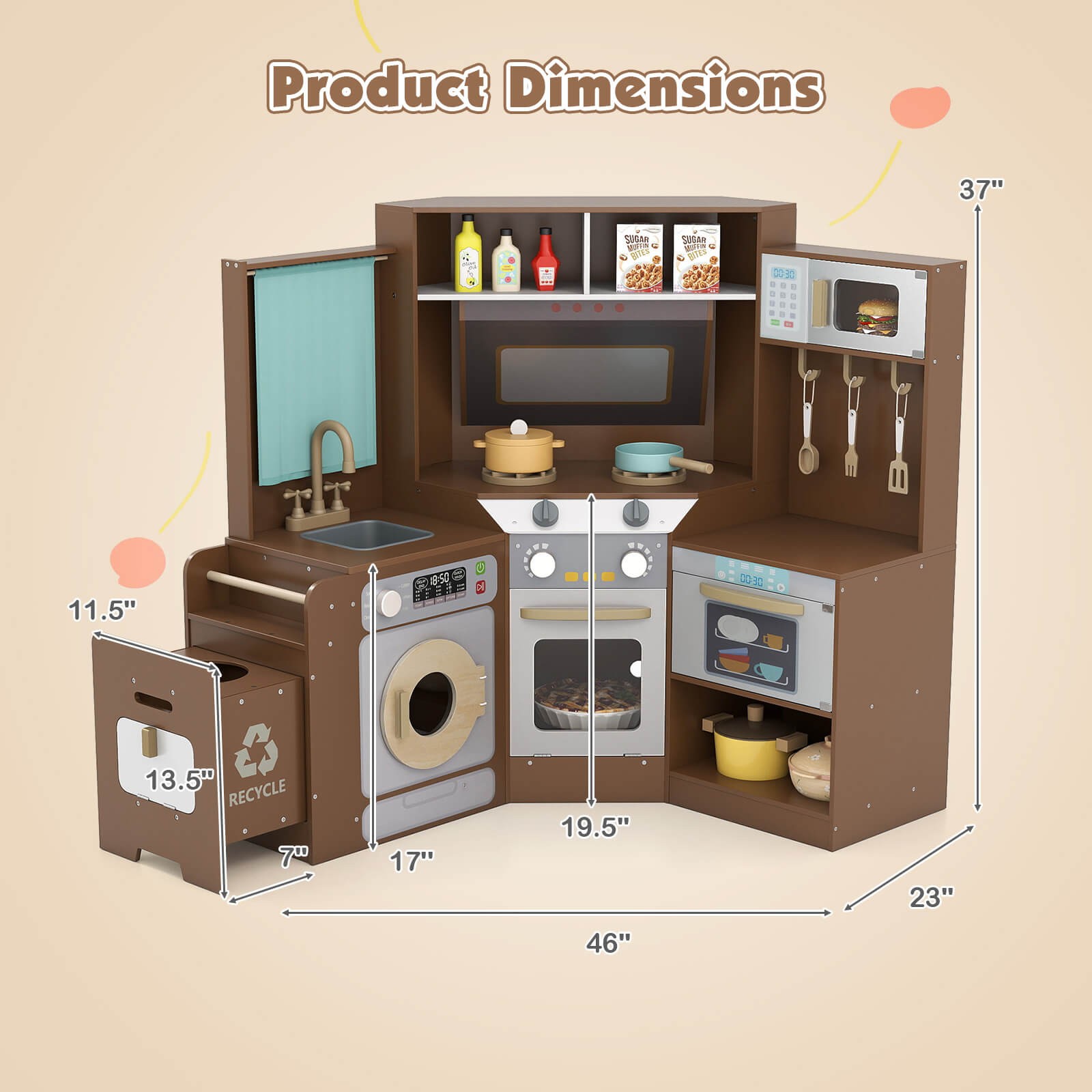 Set Includes: 1 × Corner Wooden Kitchen, 1 × Pot with Lid, 1 × Pan, 3 × Utensil