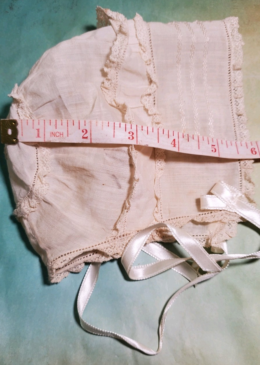 ANTIQUE CHARMING DOUBLE LACE RUFFLED BRIM EMBROIDERED BABY BONNET FOR DOLLS