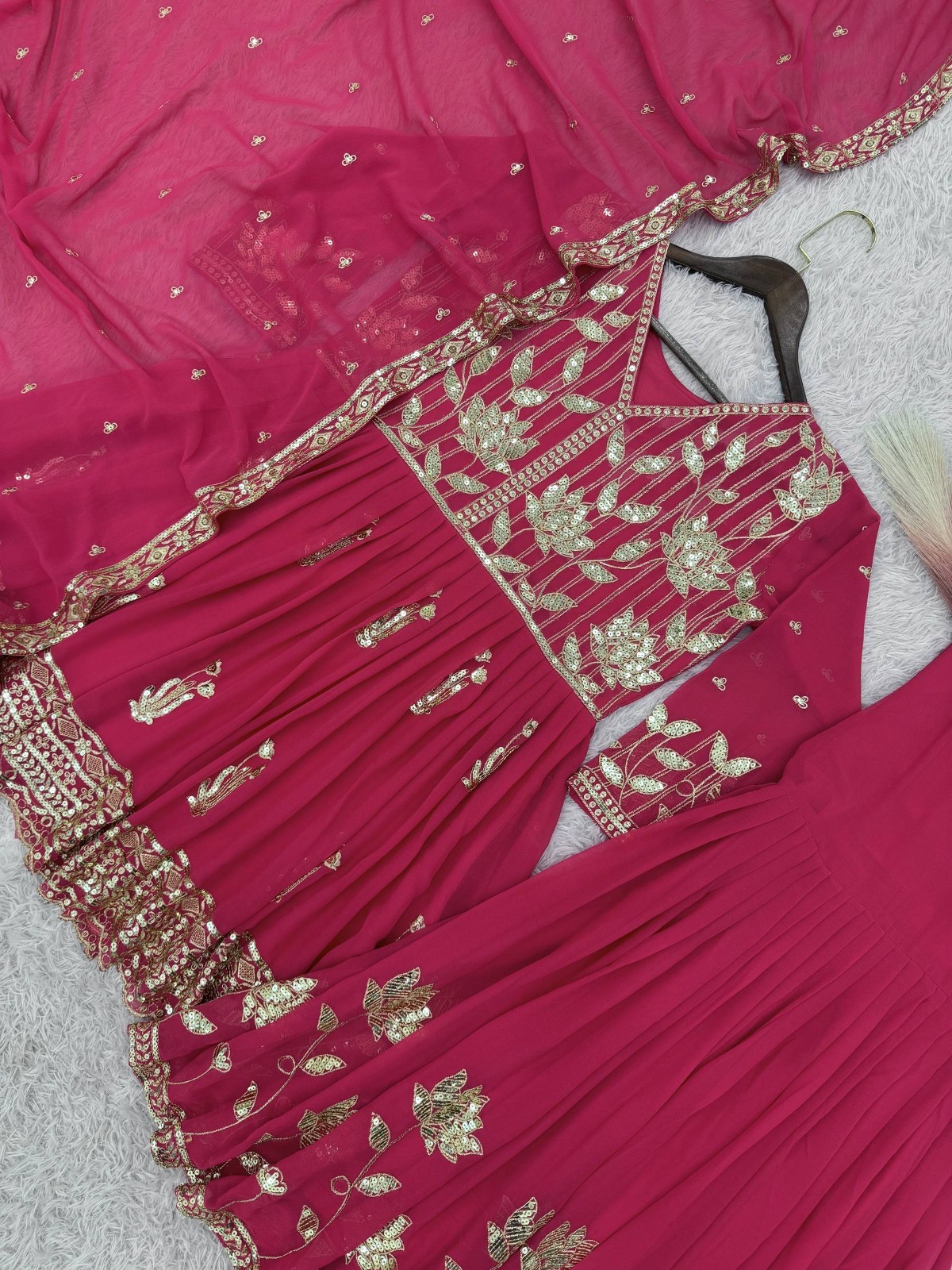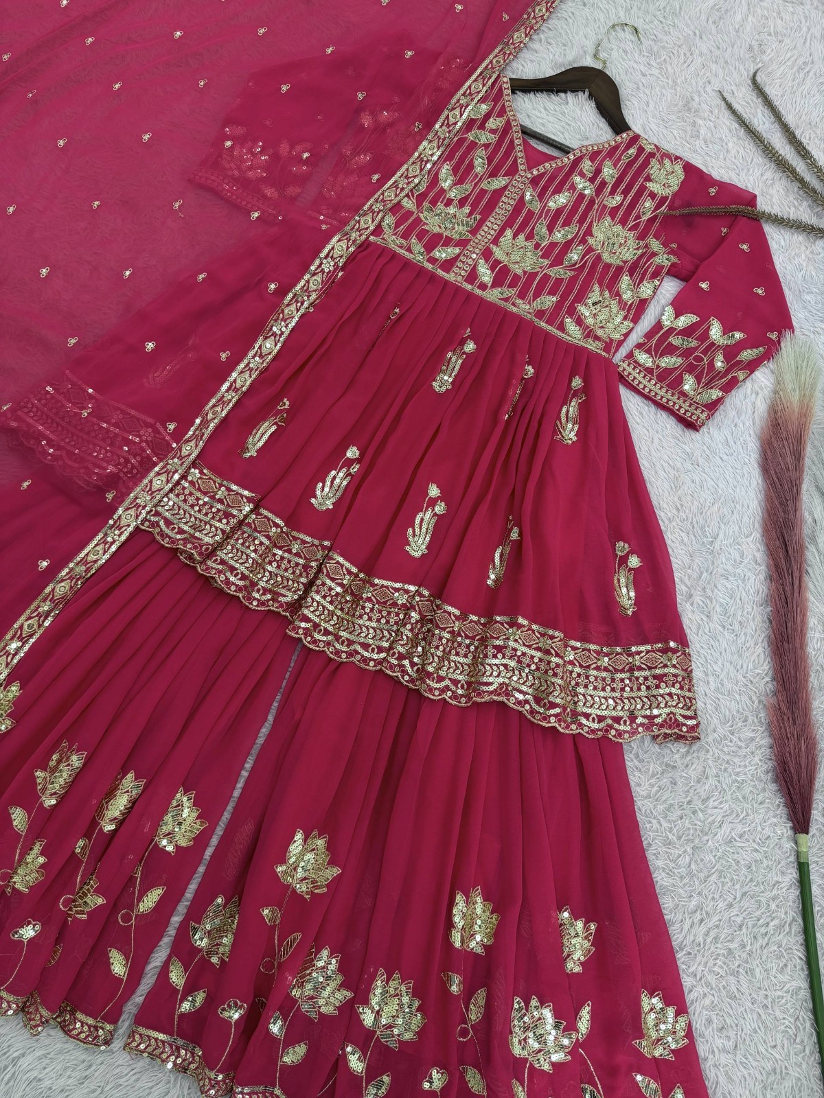 как выглядит Stylish Heavy Faux Georgette Pink Palazzo Suit With Dupatta For Functional фото