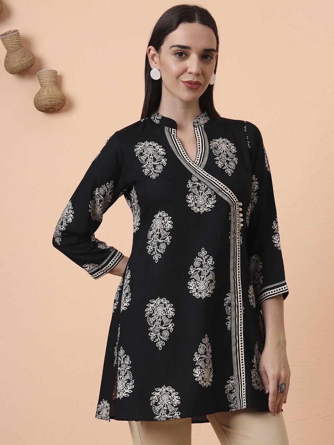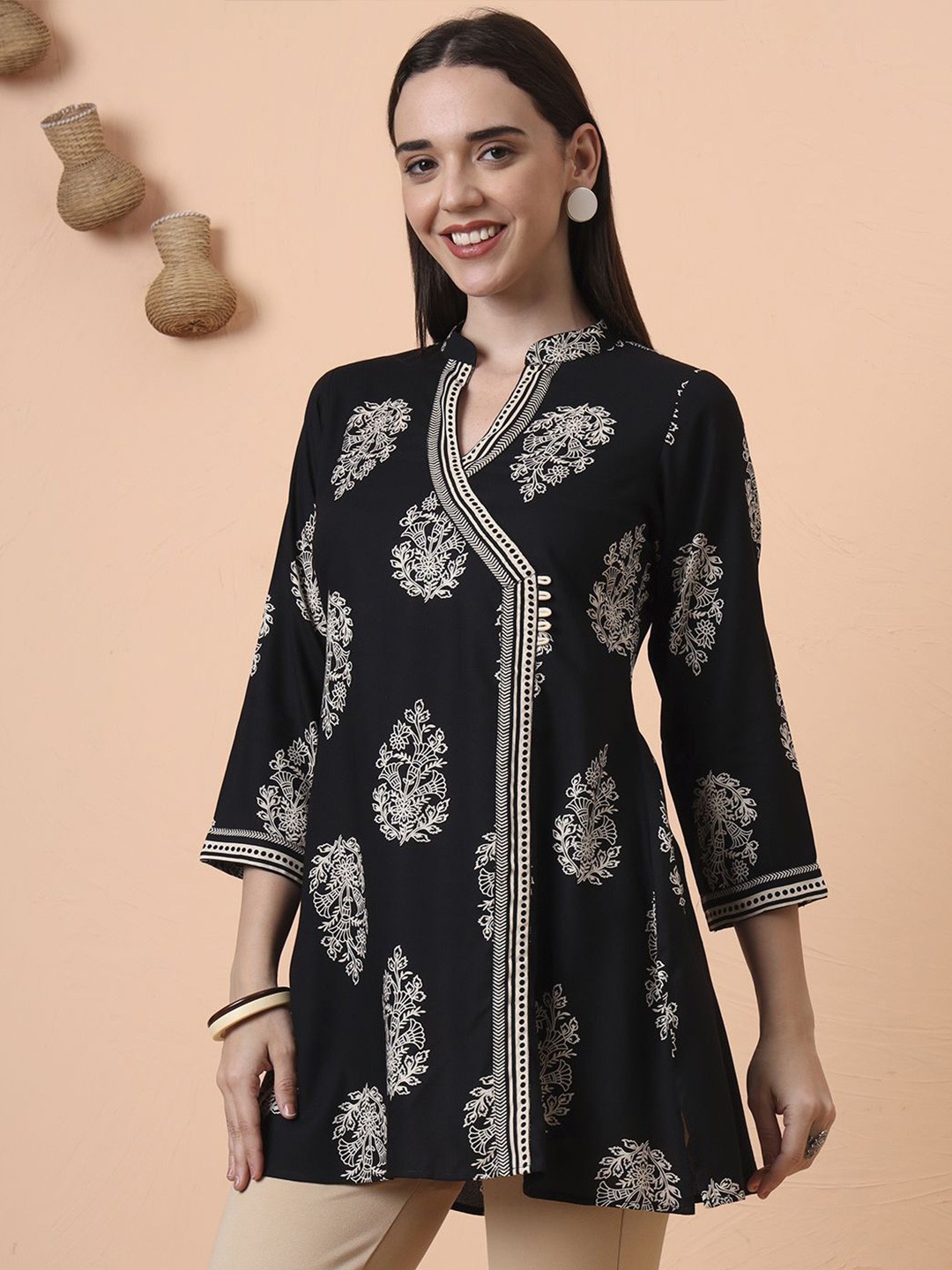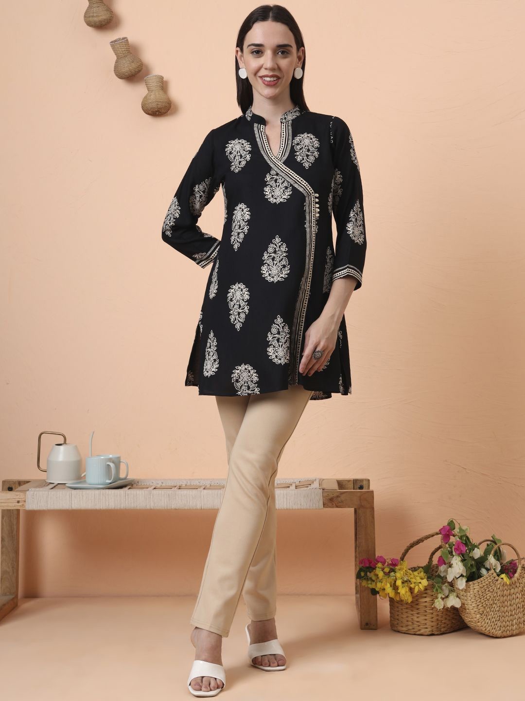 как выглядит Indian Women BEAUTIFUL Black Cotton Ethnic Motifs Printed Kurta Kurti Top Tunic фото
