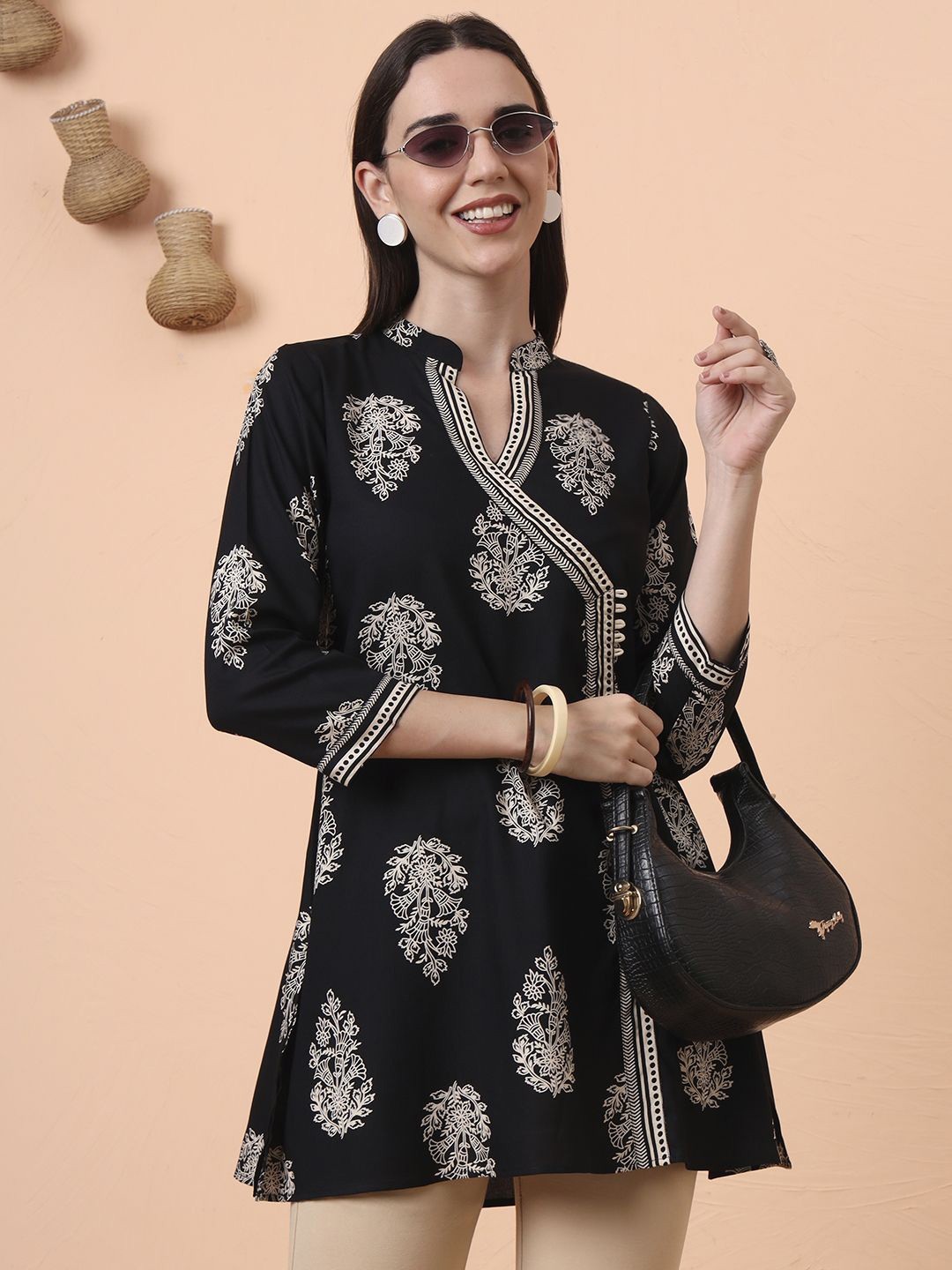 Indian Women BEAUTIFUL Black Cotton Ethnic Motifs Printed Kurta Kurti Top Tunic