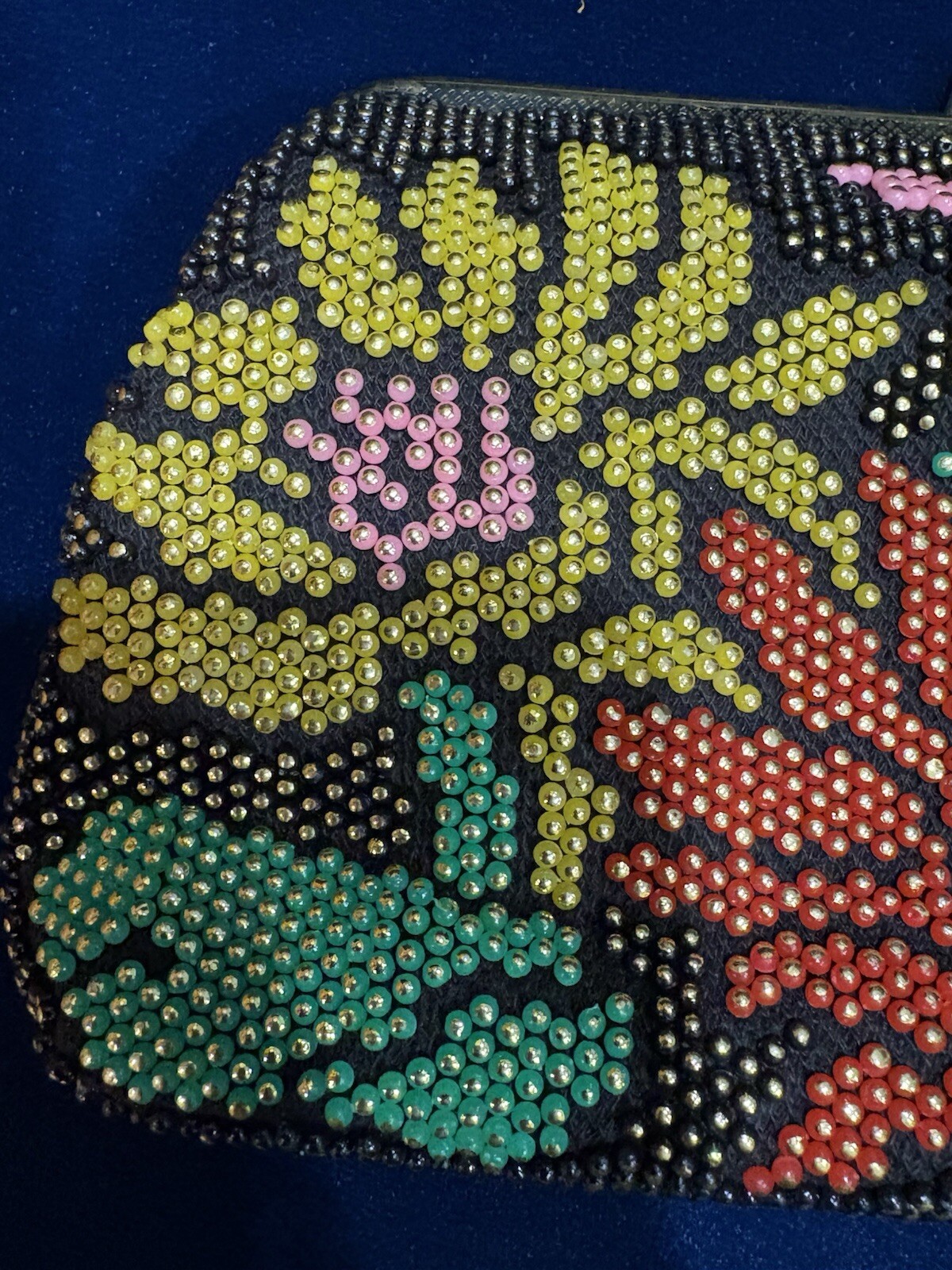 Vintage 1970s MCM Flower Beaded Cloth Clutch Evening Purse Kiss Latch Boho Style