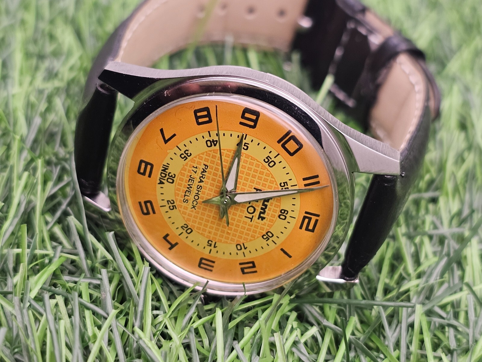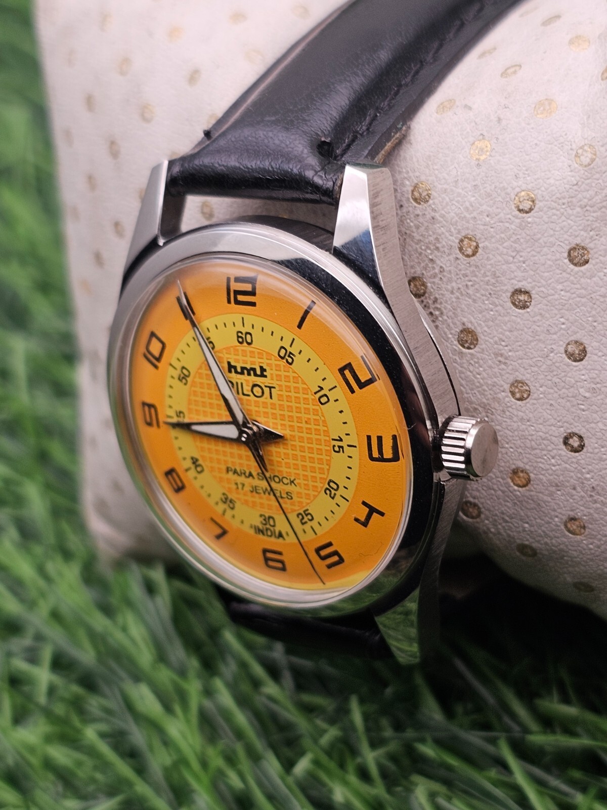 Beautiful Mens HMT Pilot Parashock Mechanical Wind 17J Watch Yellow Dial