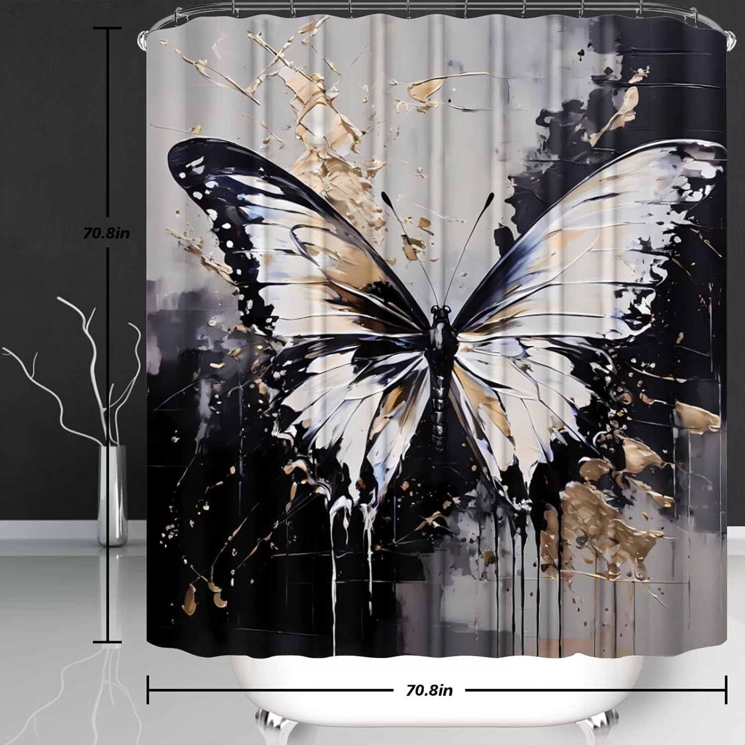 4 Pcs Black Butterfly Shower Curtain Set with Rugs Grey and Gold Bathroom Set