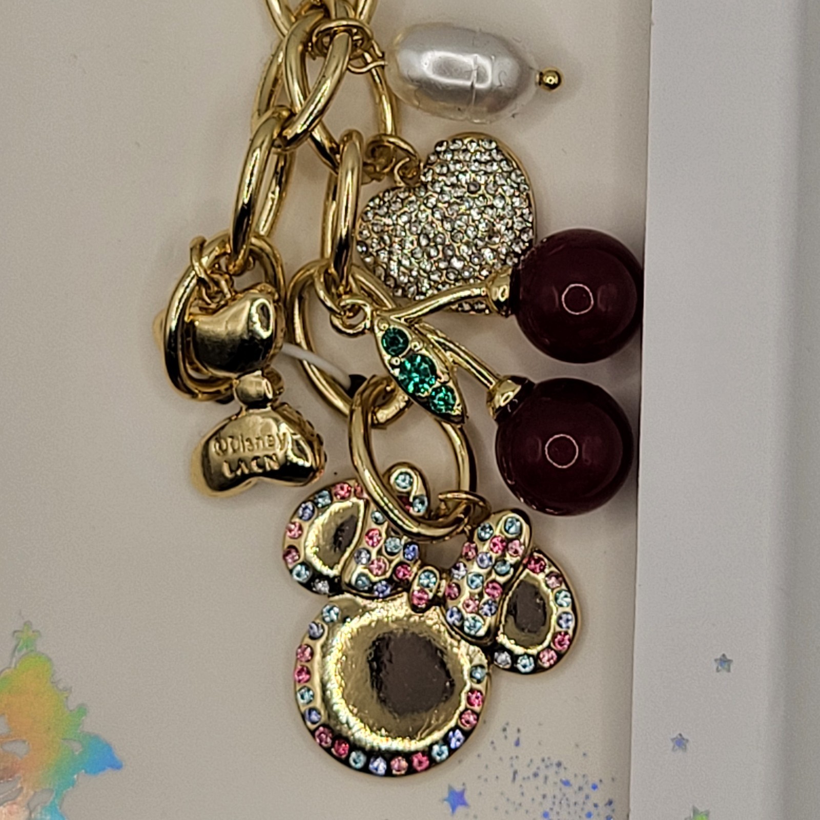 • DIisney Minnie Mouse Bag Charm Keychain Gold Tone Cherries Bow Heart