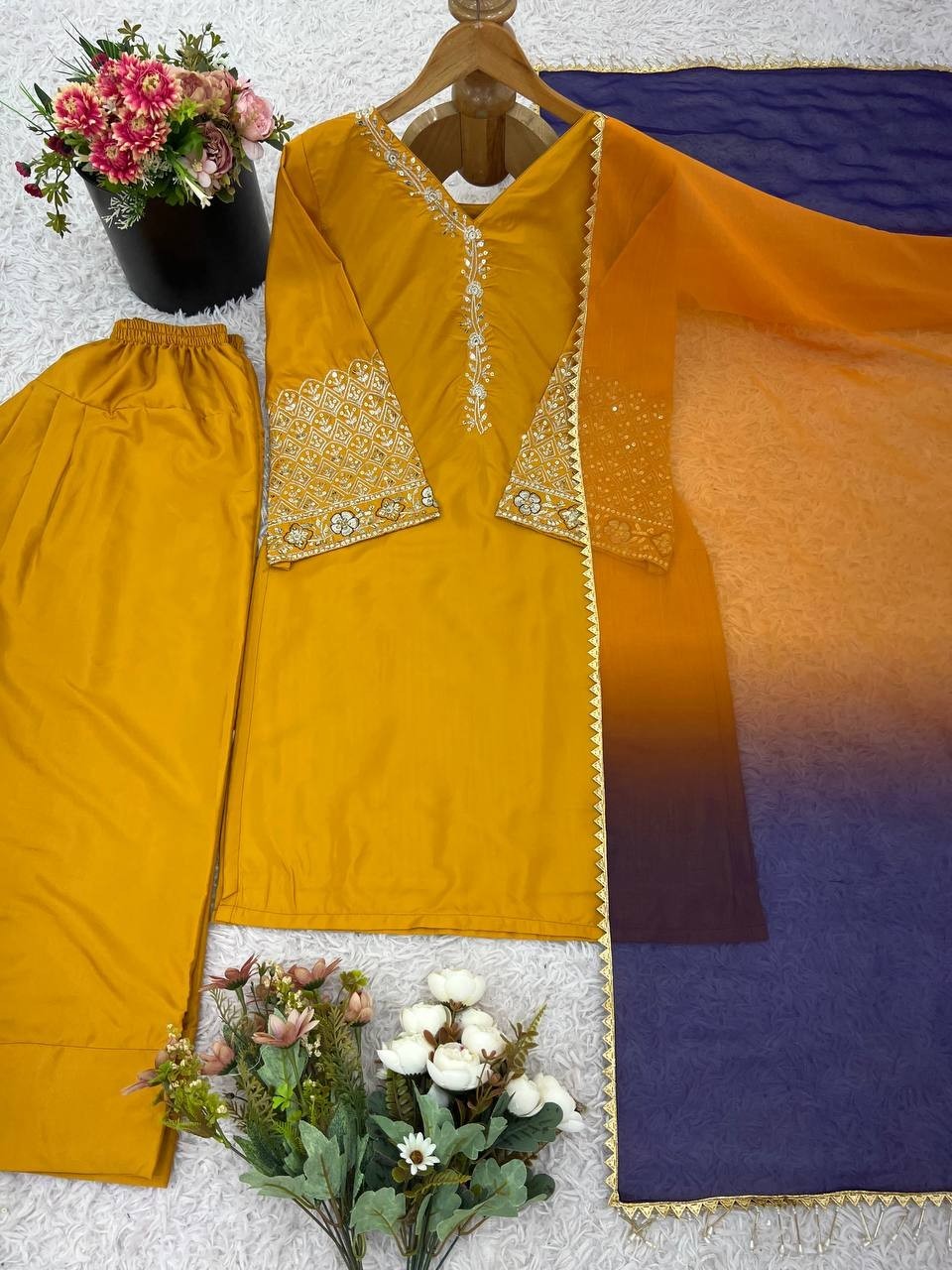 как выглядит Presenting New Natural Satin Silk Yellow Top Palazzo And Dupatta For Women фото