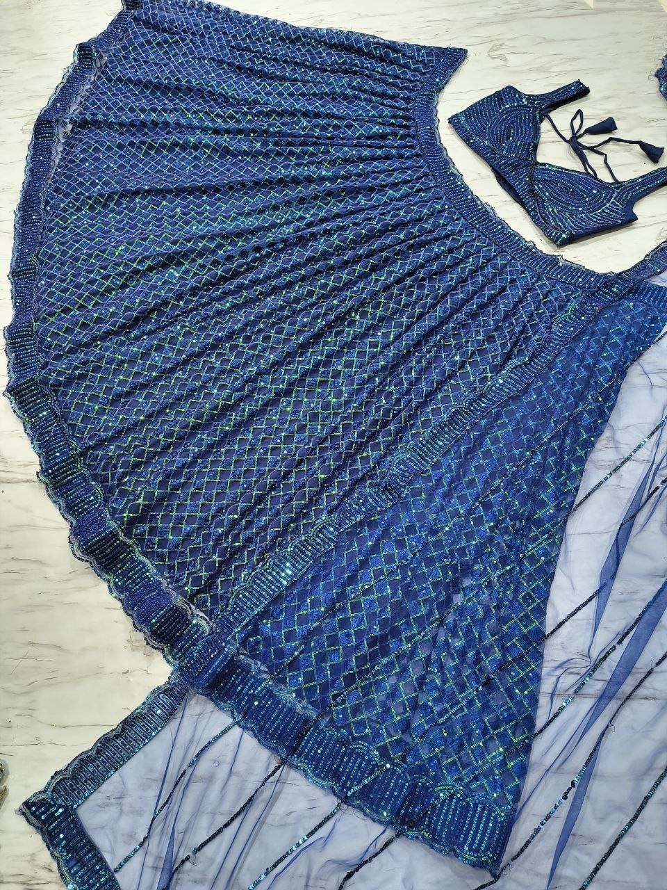 Bollywood Style Butterfly Net Blue Lehenga Choli With Dupatta For Function