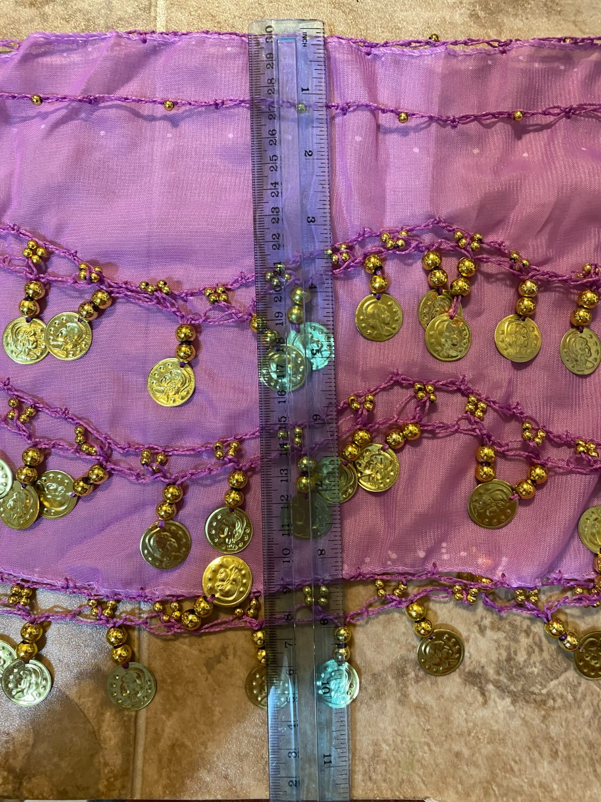 как выглядит Lilac, 55.5" wide, Womens Belly Dance Hip Scarf, 3 rows Gold Coins, 2 Row Beads фото