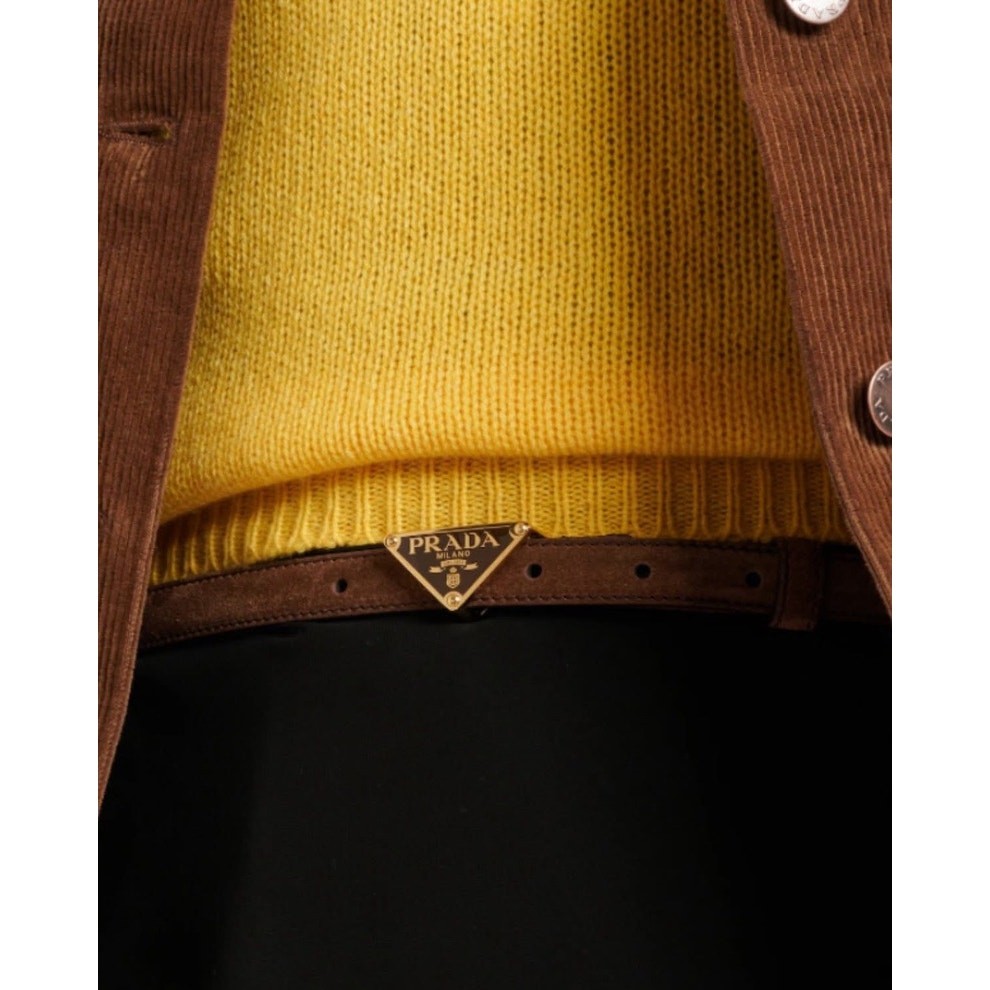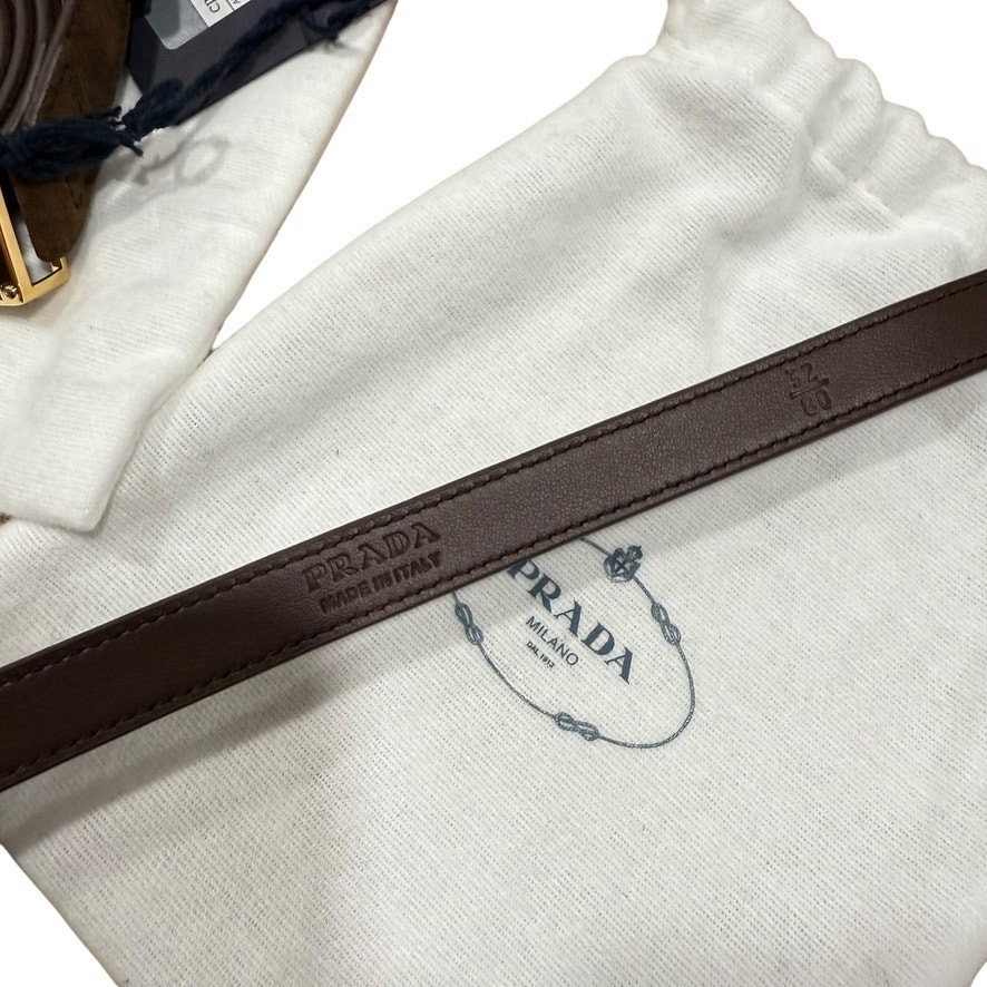 Prada 2025 Cocoa Brown Suede Triangle Logo Thin Skinny Womens Belt Size 80