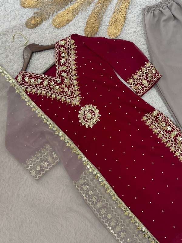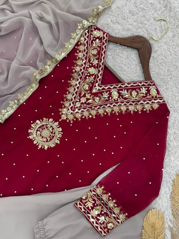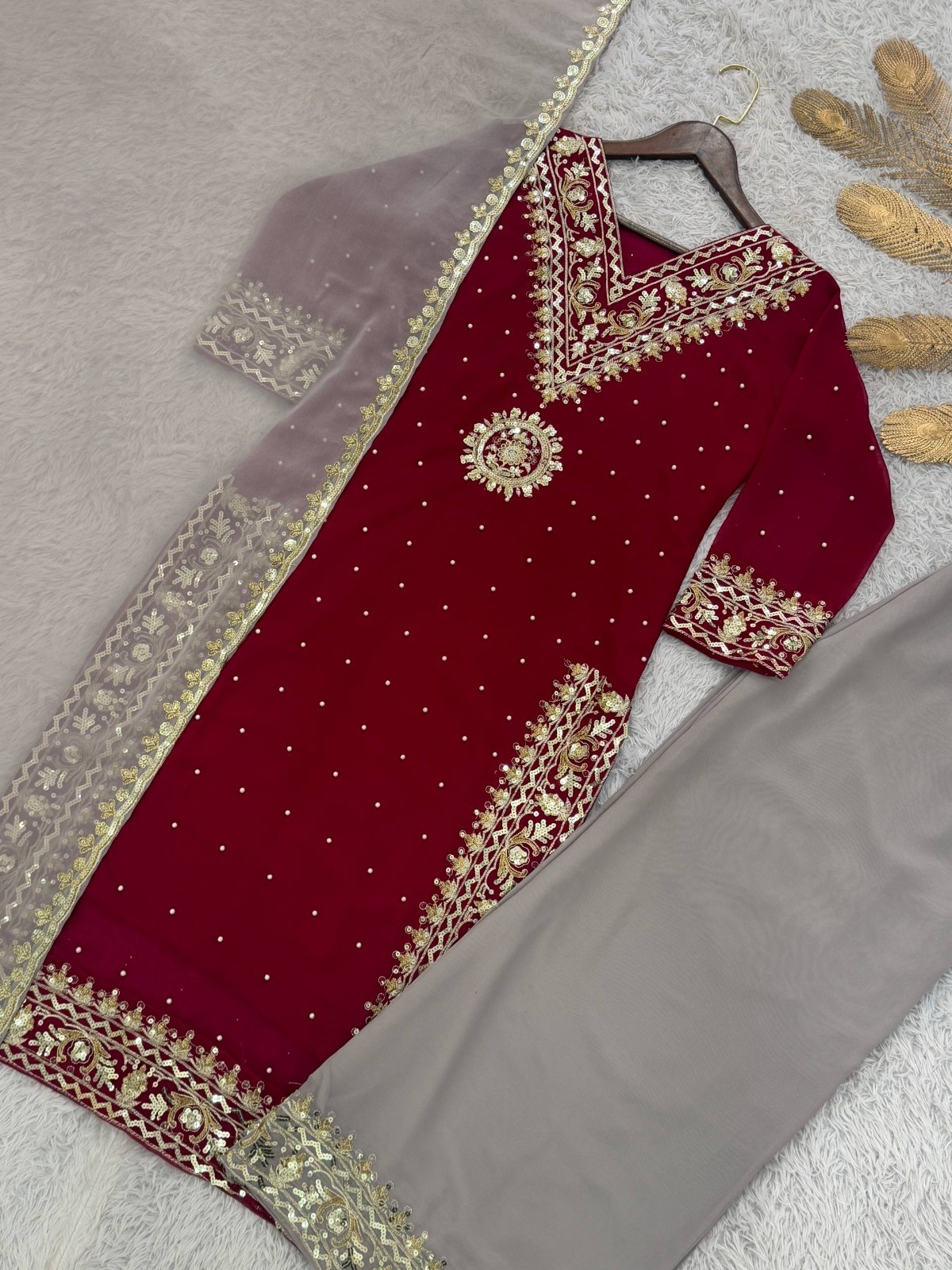 Stunning Maroon Faux Georgette Palazzo Suit With Dupatta For Festival