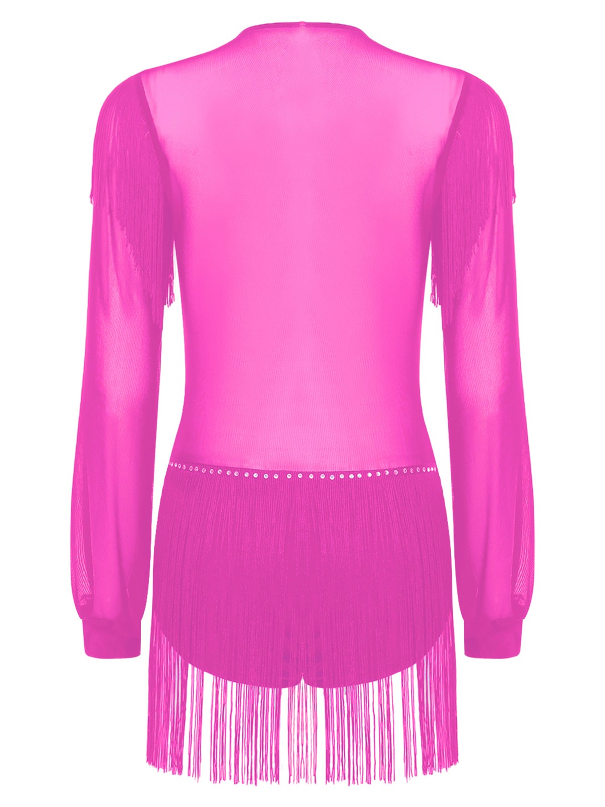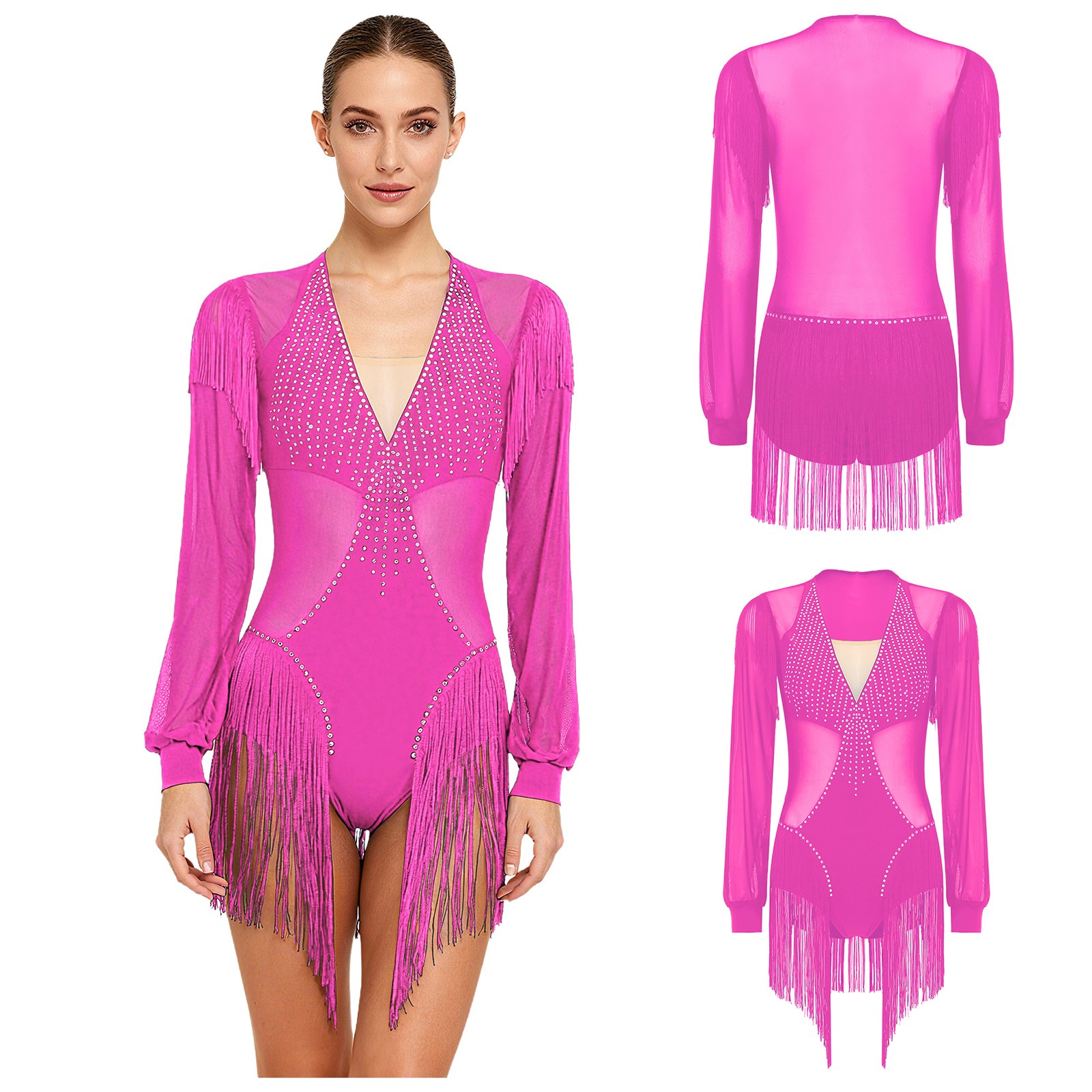 как выглядит Womens Dress Sequins Leotard Long Sleeve Jumpsuit Tassel Dancewear Mesh Costume фото