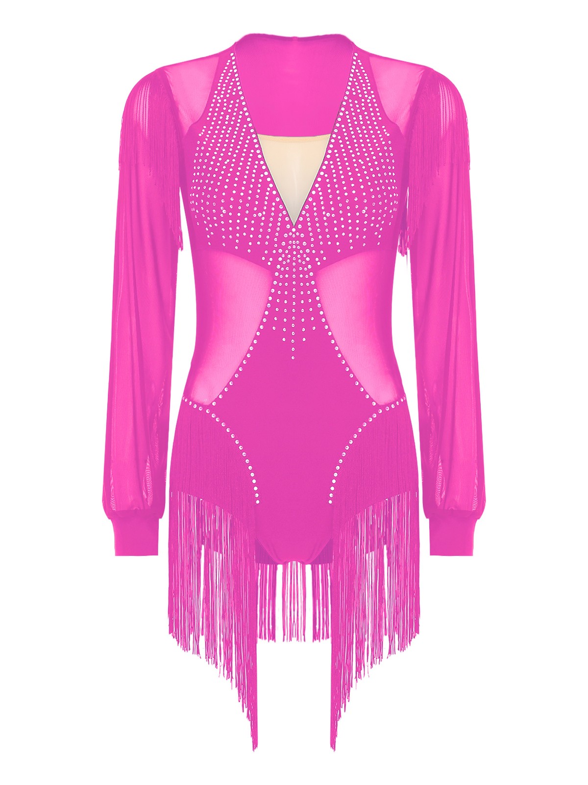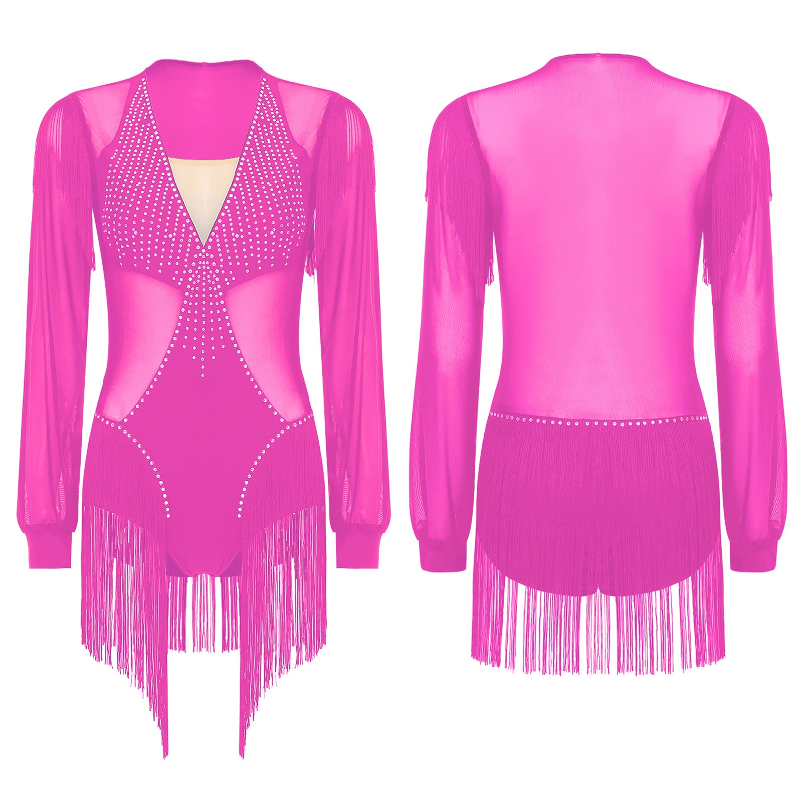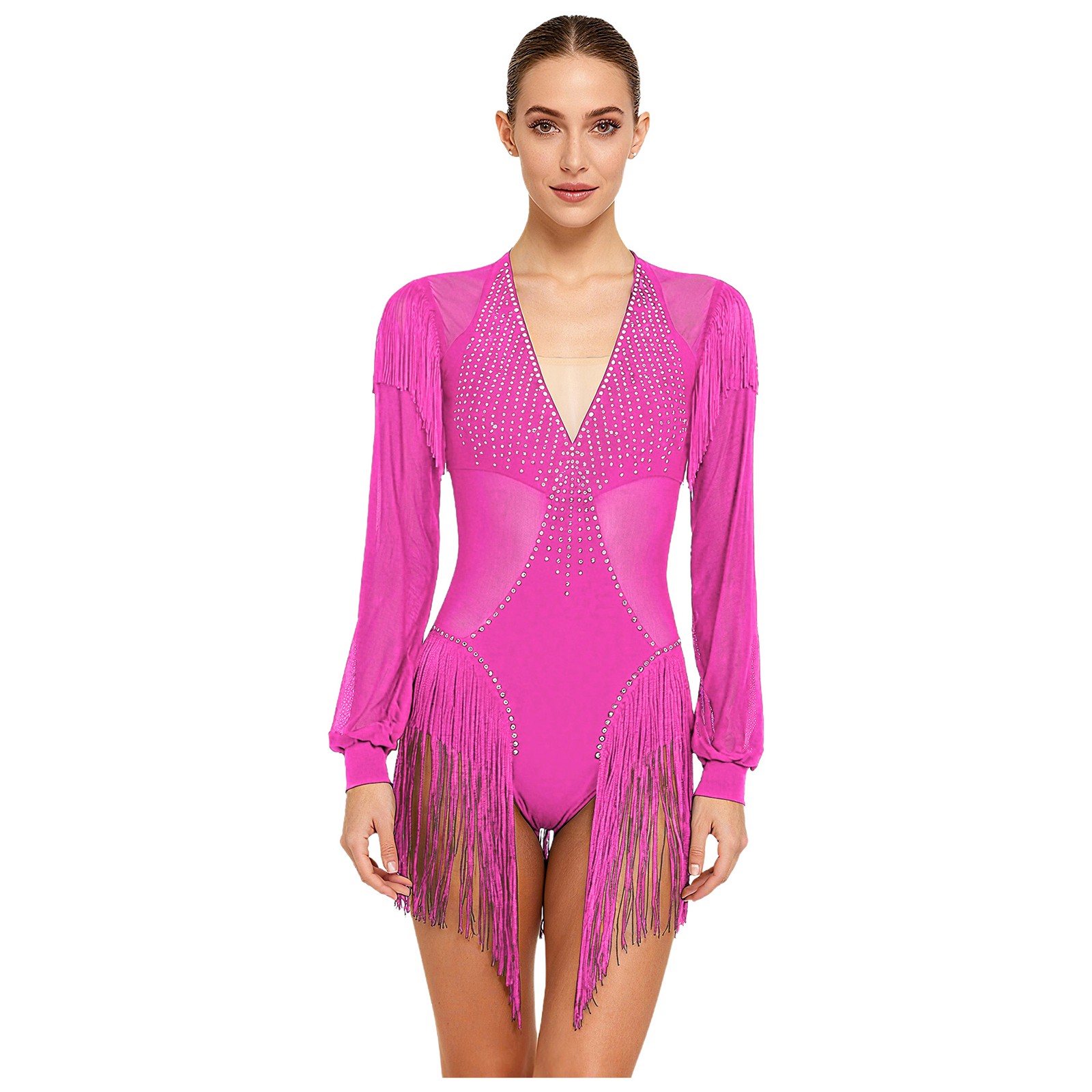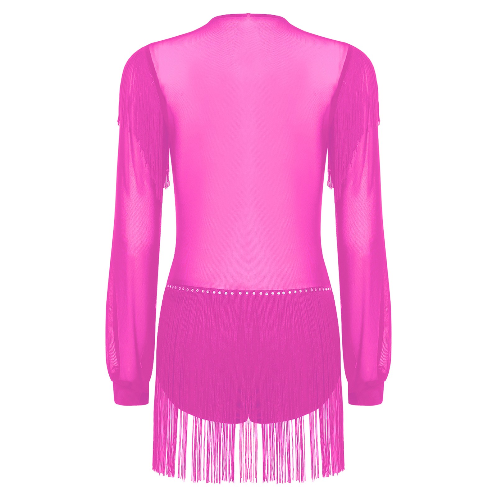 Womens Dress Sequins Leotard Long Sleeve Jumpsuit Tassel Dancewear Mesh Costume