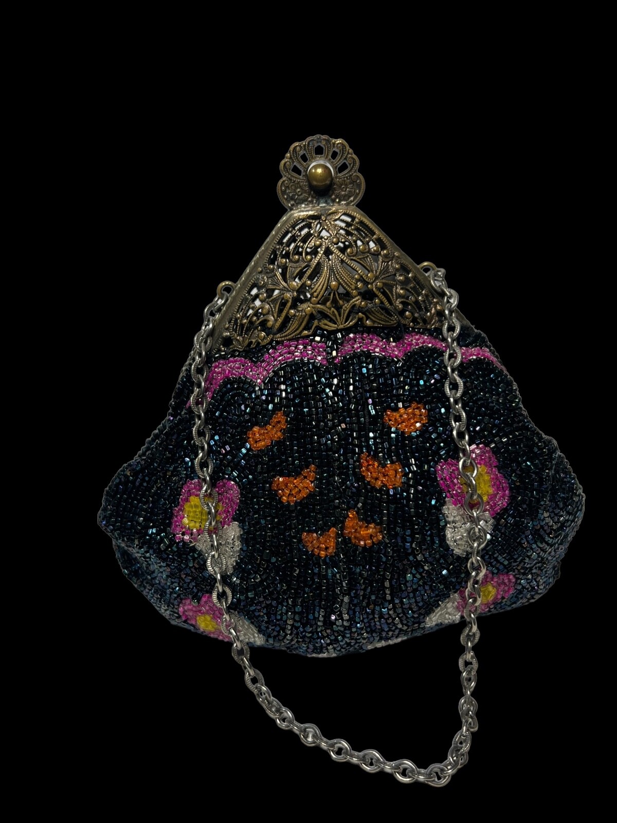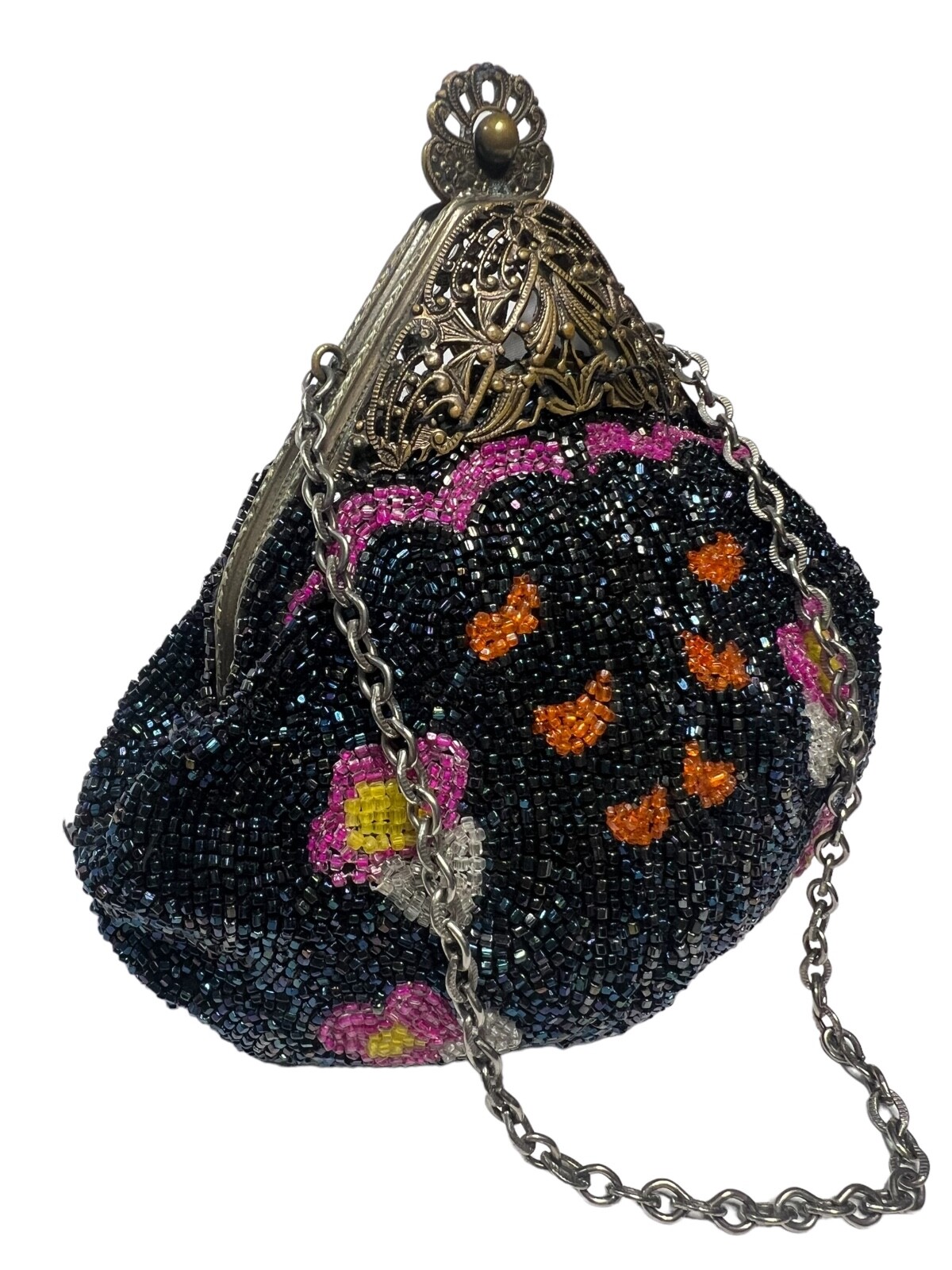 Cocktail Hand Beaded Purse Brass Fligree Metal Closure Dark Blue Pink HNG104