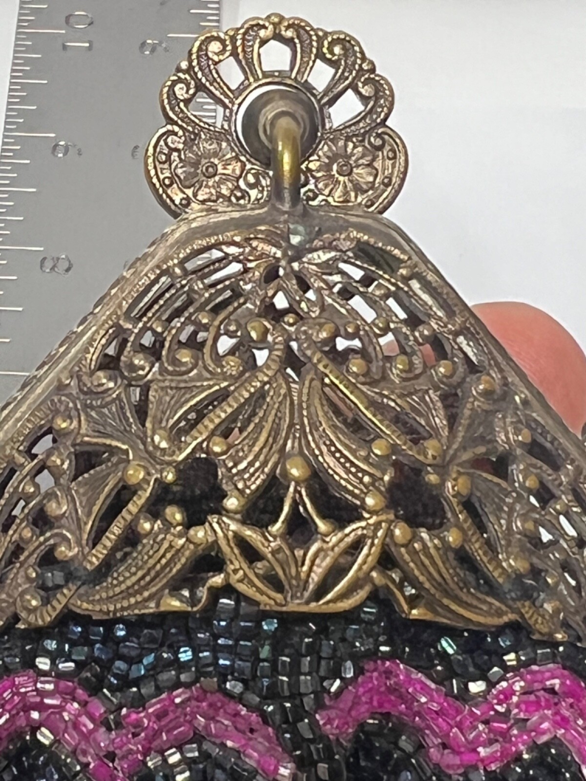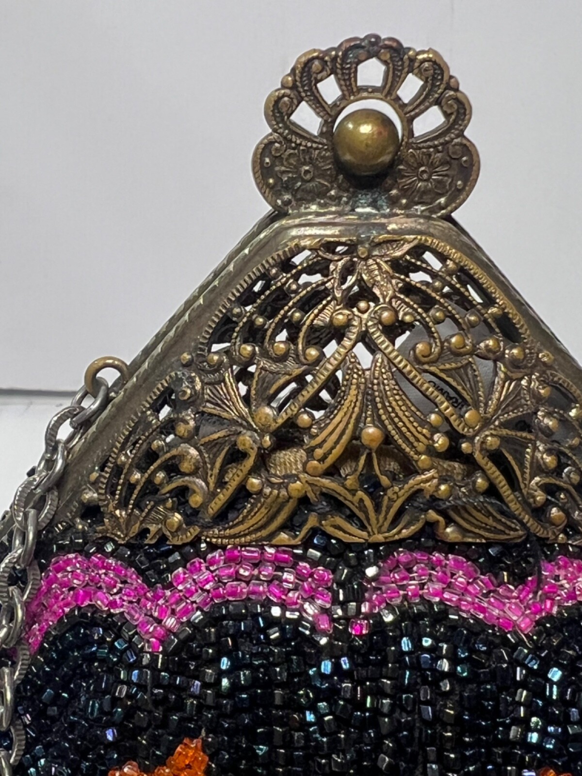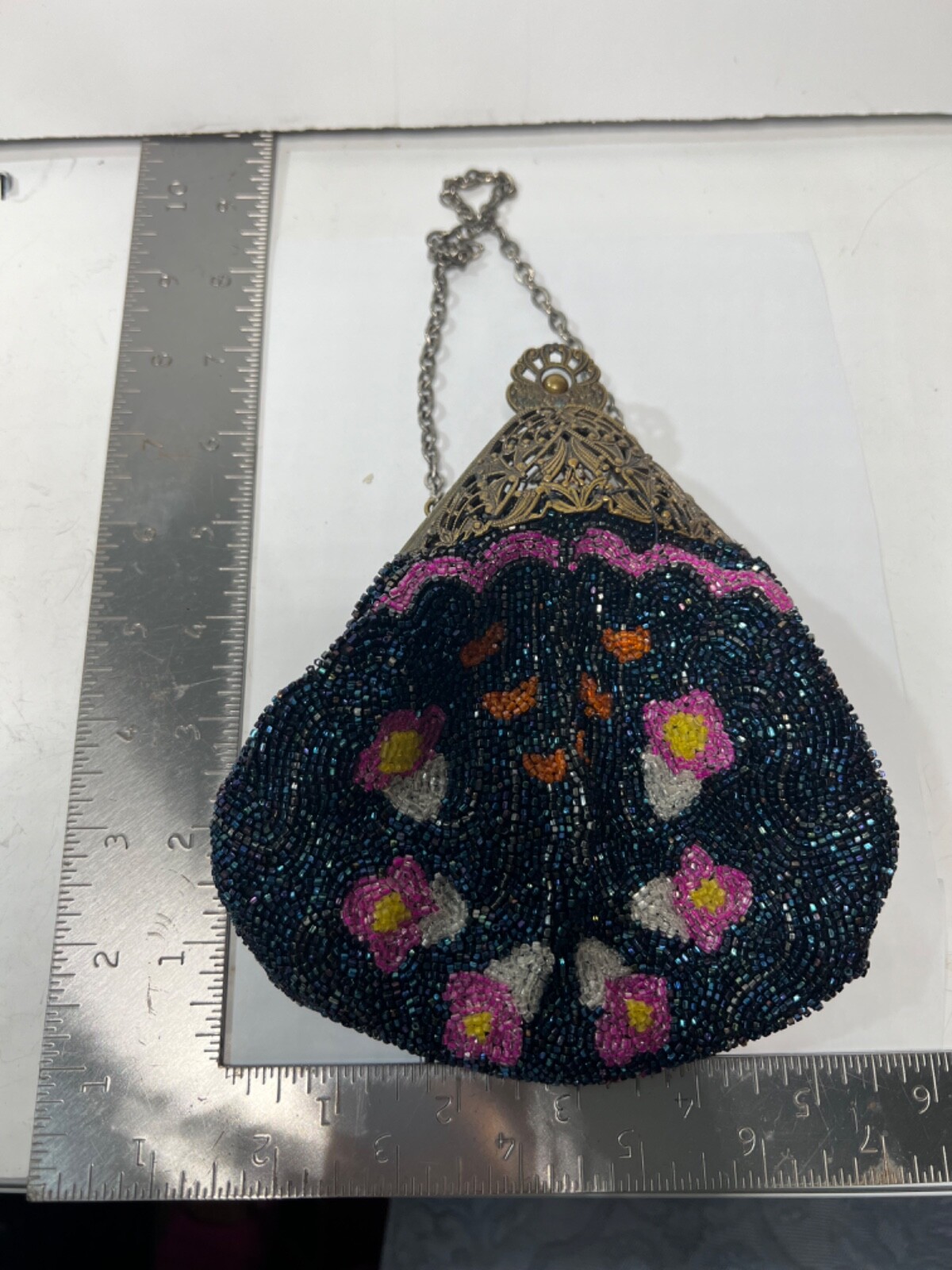 как выглядит Cocktail Hand Beaded Purse Brass Fligree Metal Closure Dark Blue Pink HNG104 фото
