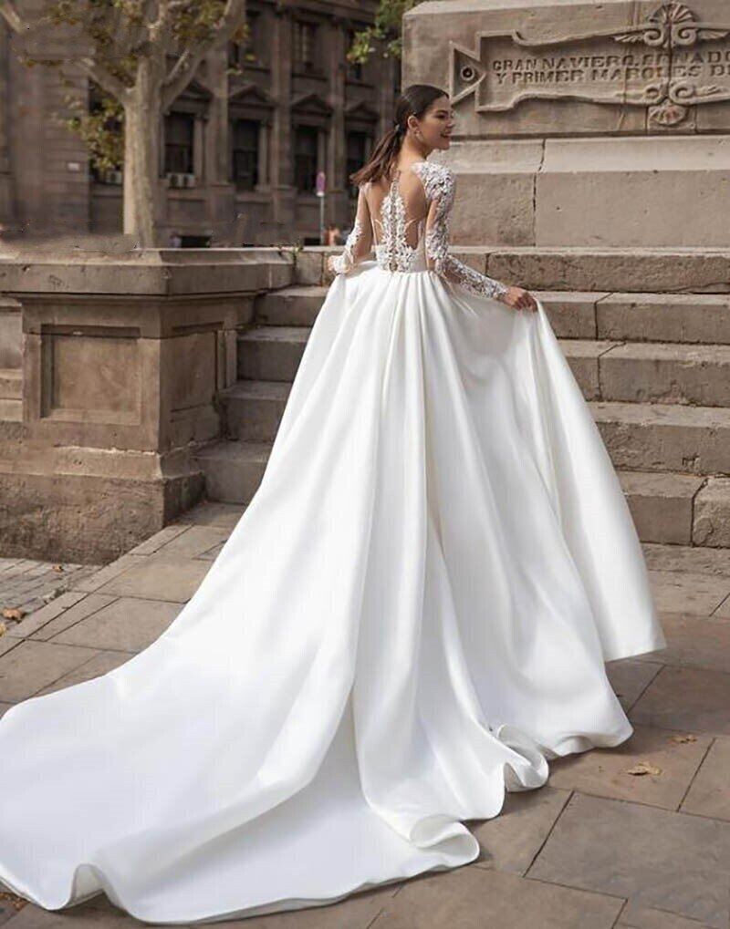 как выглядит Elegant Long Sleeves Wedding Dresses Satin Lace Illusion Back Bridal Gowns фото