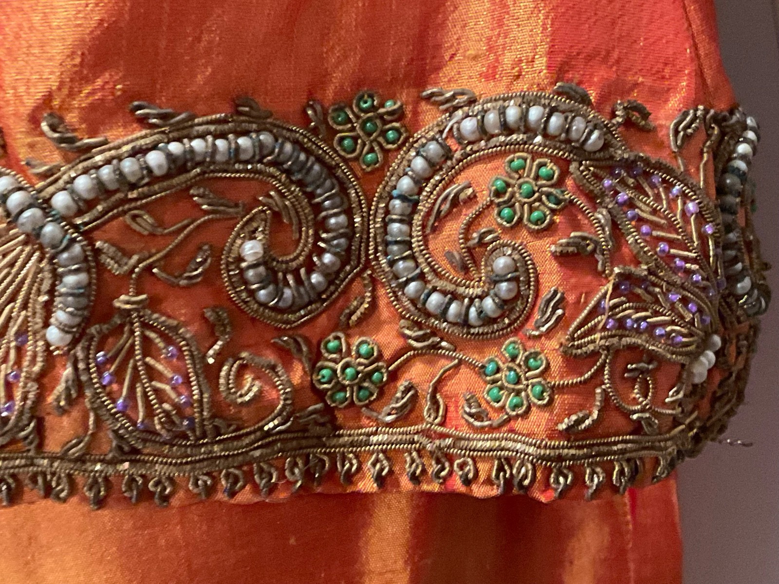 Vintage India 1970s Silk Couture Pant Suit Orange Metallic Metal Glass Beading