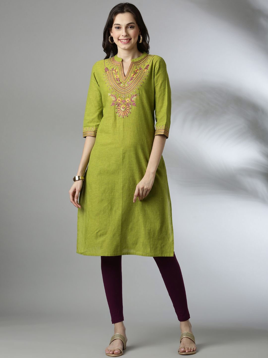 Indian Women Green Cotton Thread Work Solid Kurta Kurtis Top Tunic New Dress