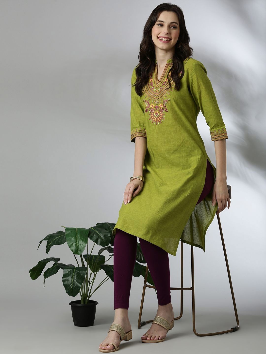 как выглядит Indian Women Green Cotton Thread Work Solid Kurta Kurtis Top Tunic New Dress фото