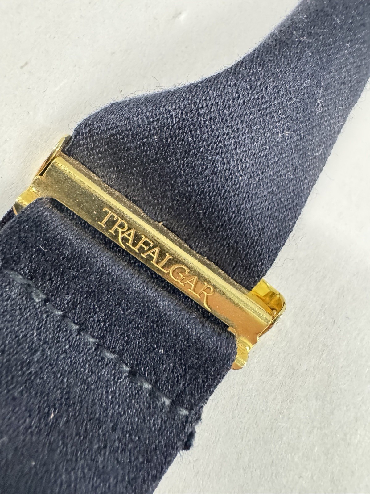 Trafalgar Men s Navy Suspenders Braces w/ Gold Crest Embroidery Leather Ends
