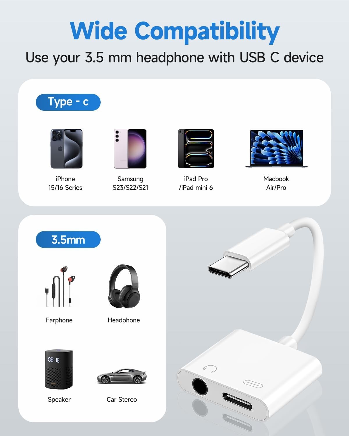 USB C to 3.5mm Headphone and Charger Adapter, 2-Pack Type C 2 Pack, White