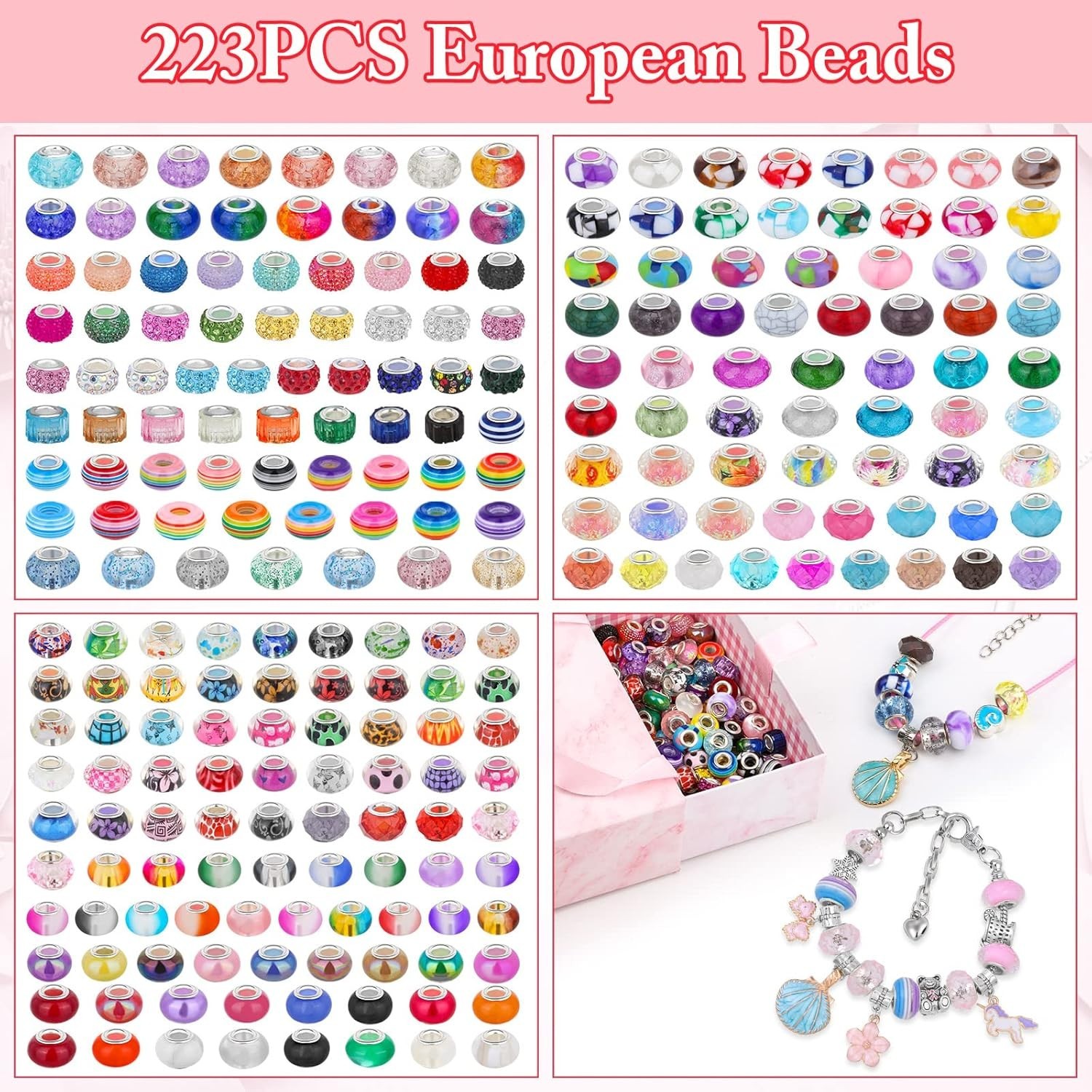 Large Hole Glass Beads for Jewelry Making, 224PCS European Beads Bulk Mixed C...