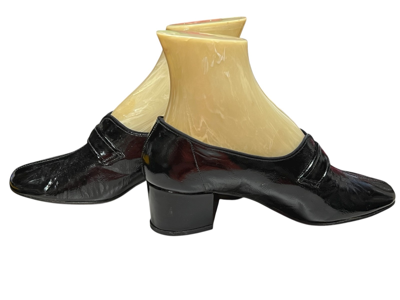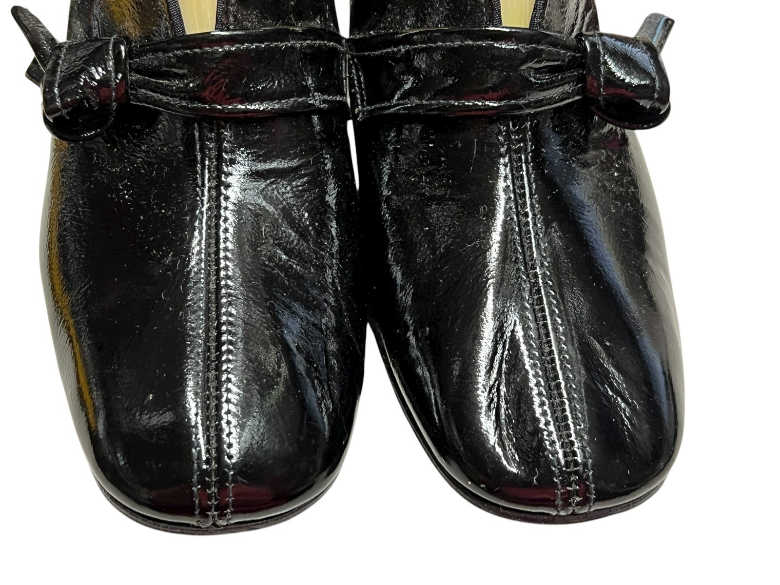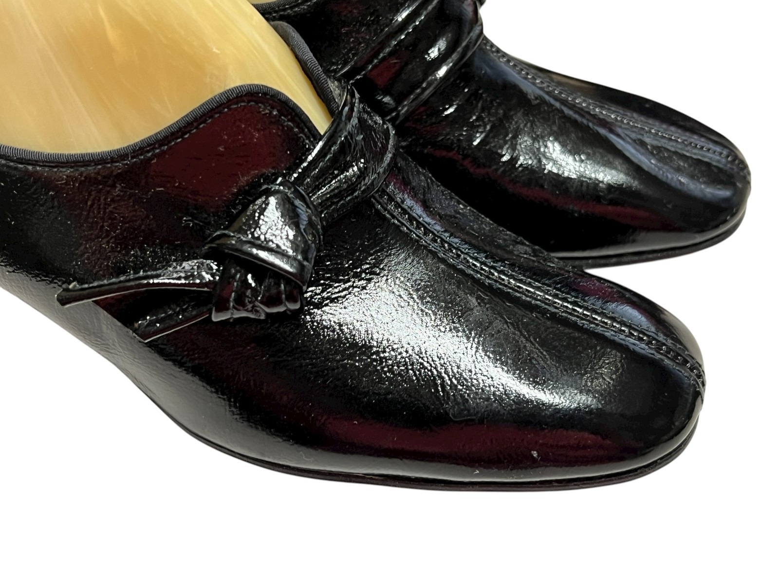 как выглядит 5.5 NOS Vtg 70s Shoe MOD GoGo CHUNKY HEEL Black Shiny Crinkle LEATHER Side Knot фото